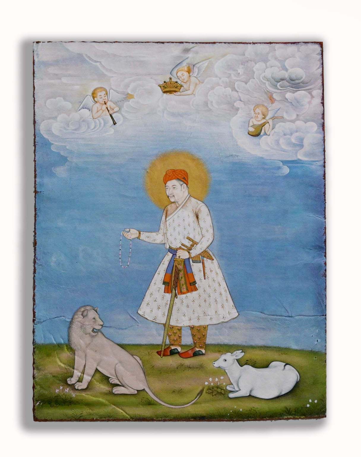 “Akbar With Lion and Calf“, Folio from the Shah Jahan Album verso: ca. 1630; recto: ca. 1530–50. Painting by Govardhan. This posthumous portrait of Akbar incorporates the Elizabethan-derived motif of a lion and calf living in peace under the emperor’s benign rule.