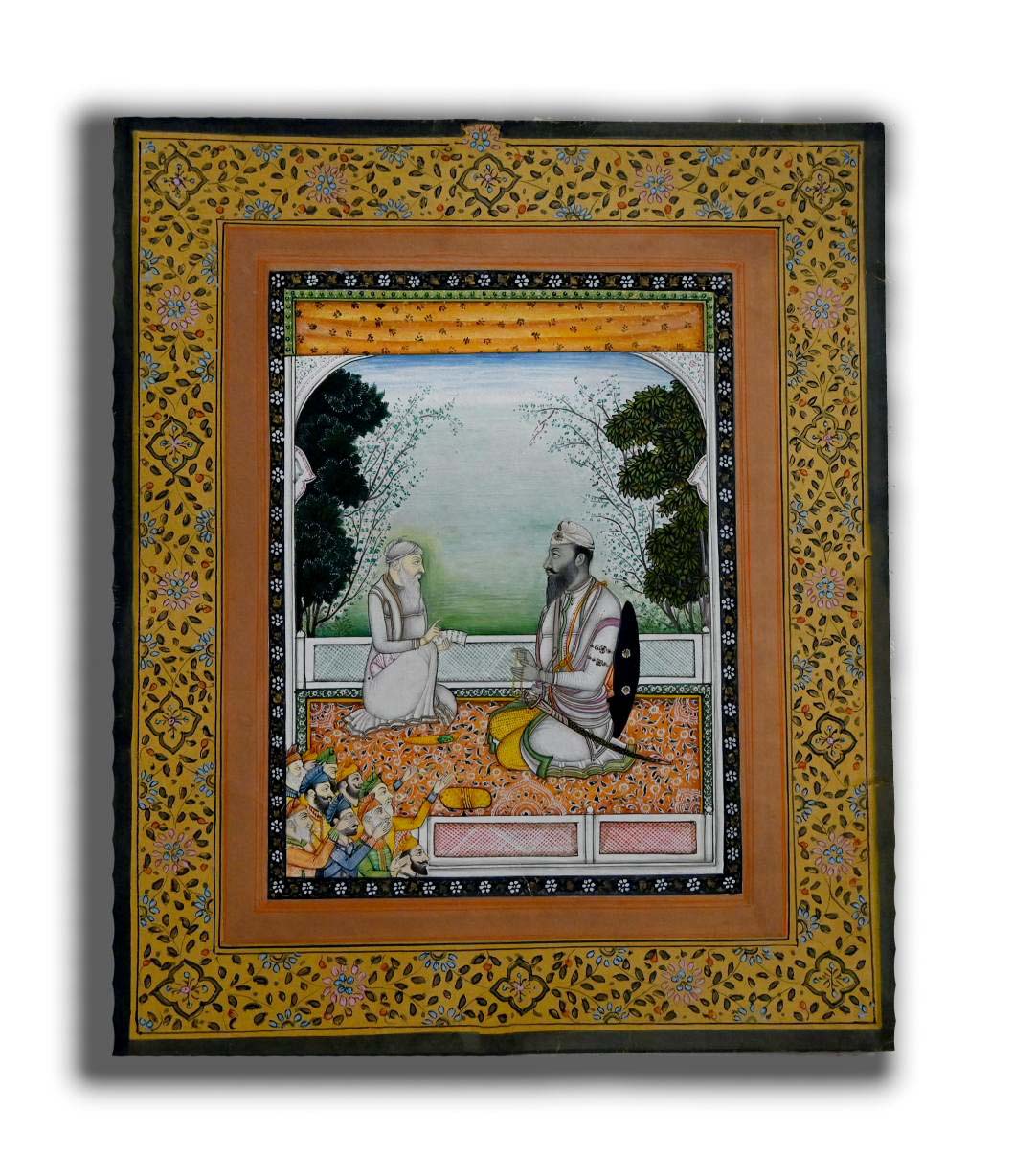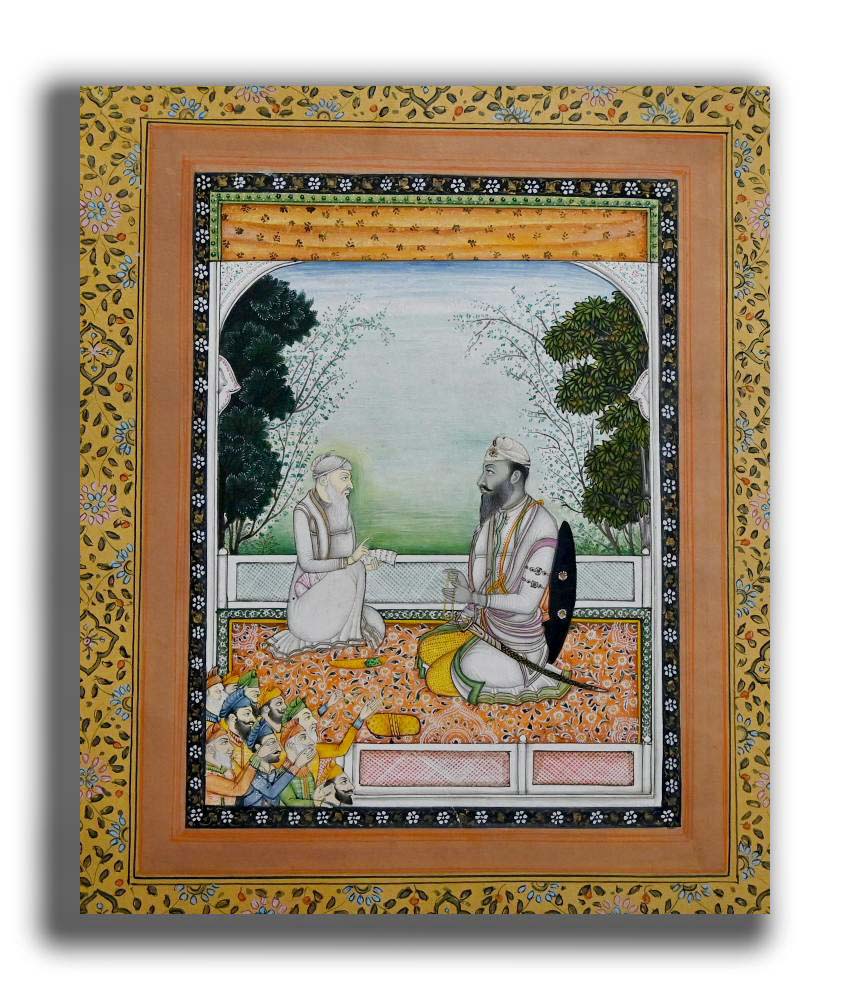 Maharaja Ranjit Singh Went to Sikh Guru Handmade Painting with Floral Border