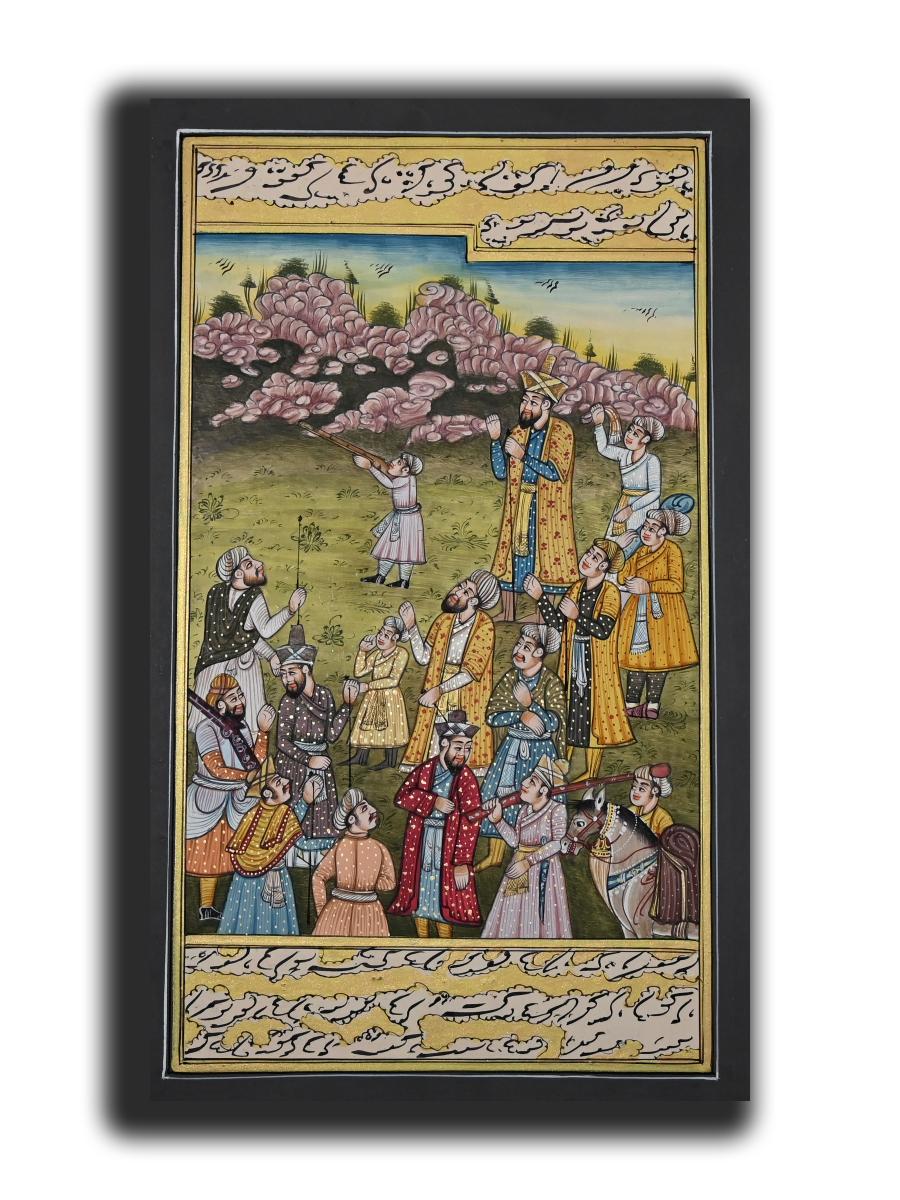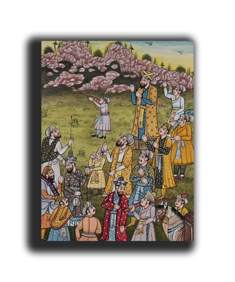 Presenting the historical artwork when Bahram Khan watching badshah akbar learning shoot handmade miniature mughal painting home decor artwork.