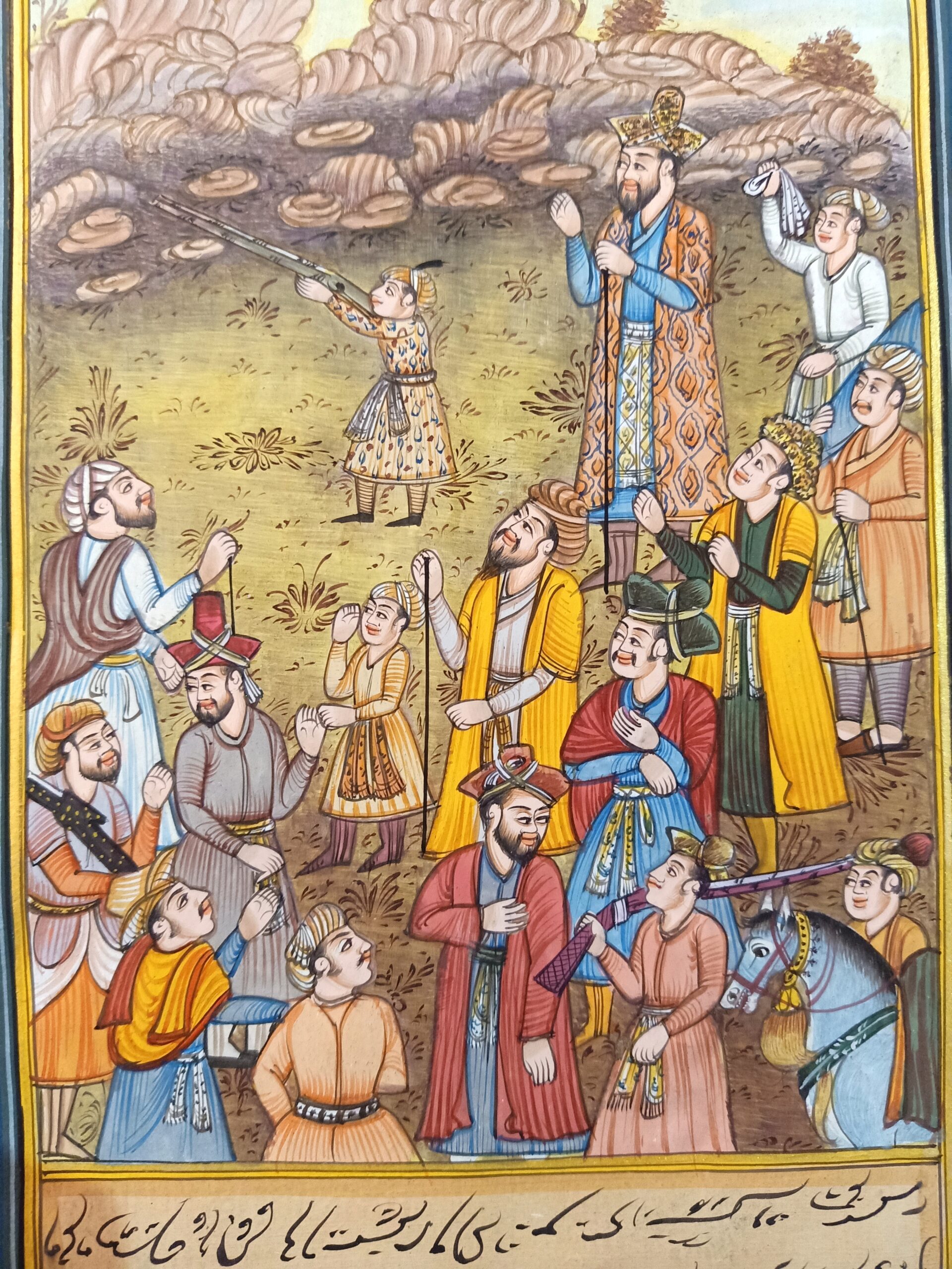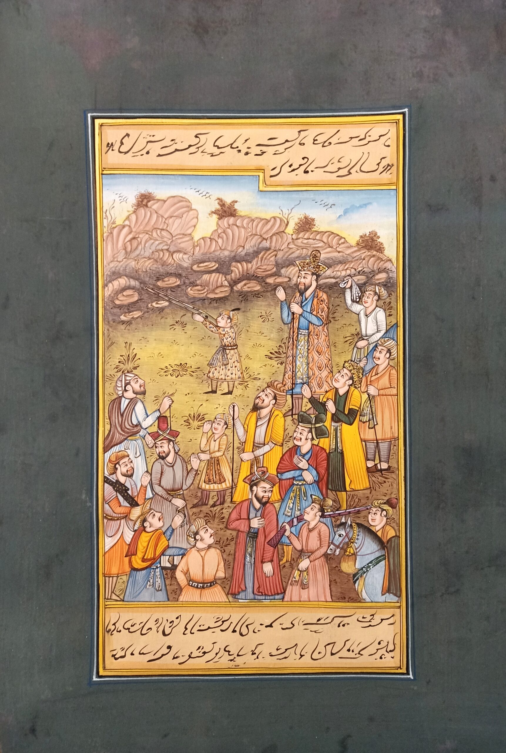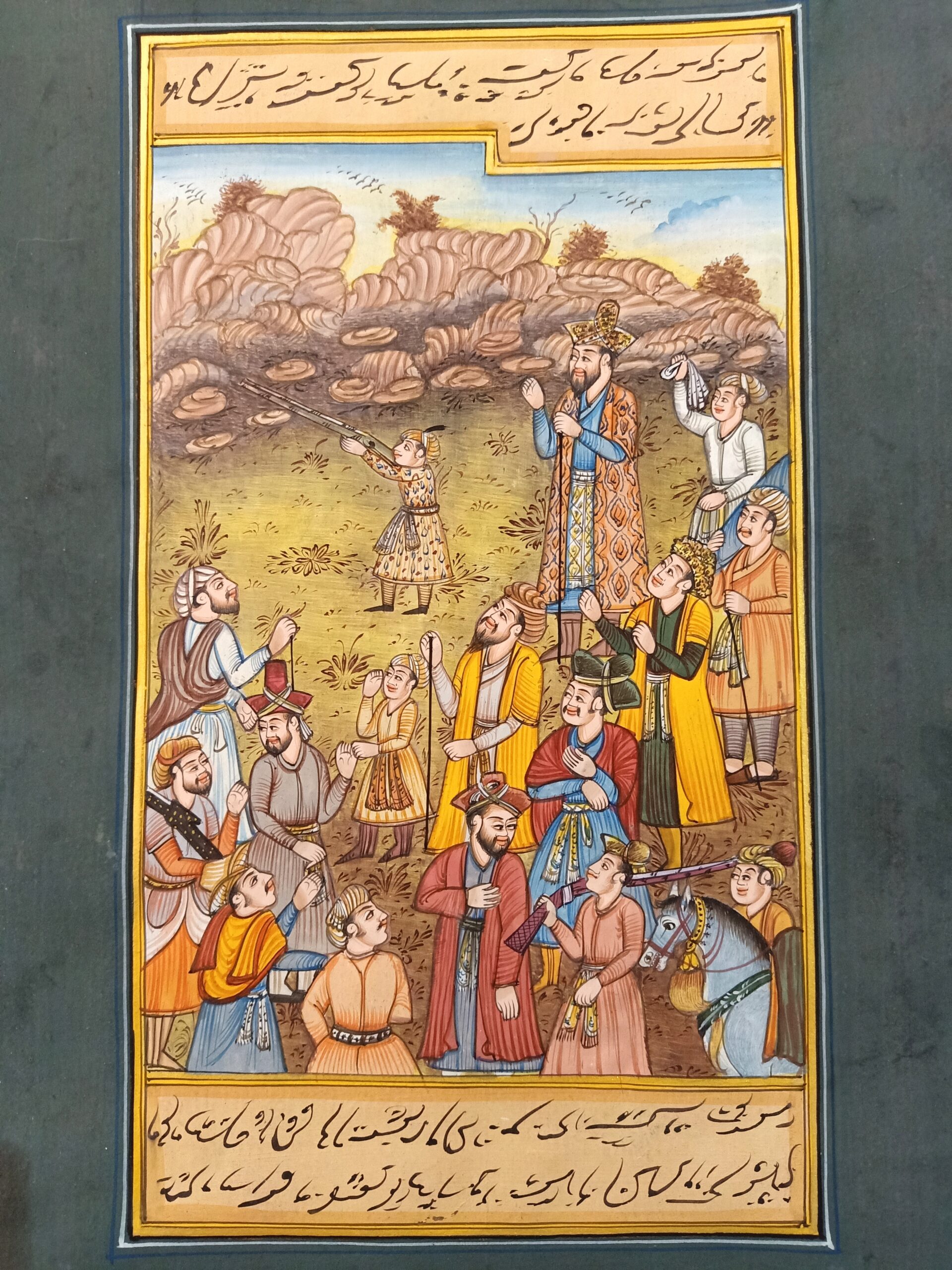 Presenting the historical artwork when Bahram Khan watching badshah akbar learning shoot handmade miniature mughal painting home decor artwork.