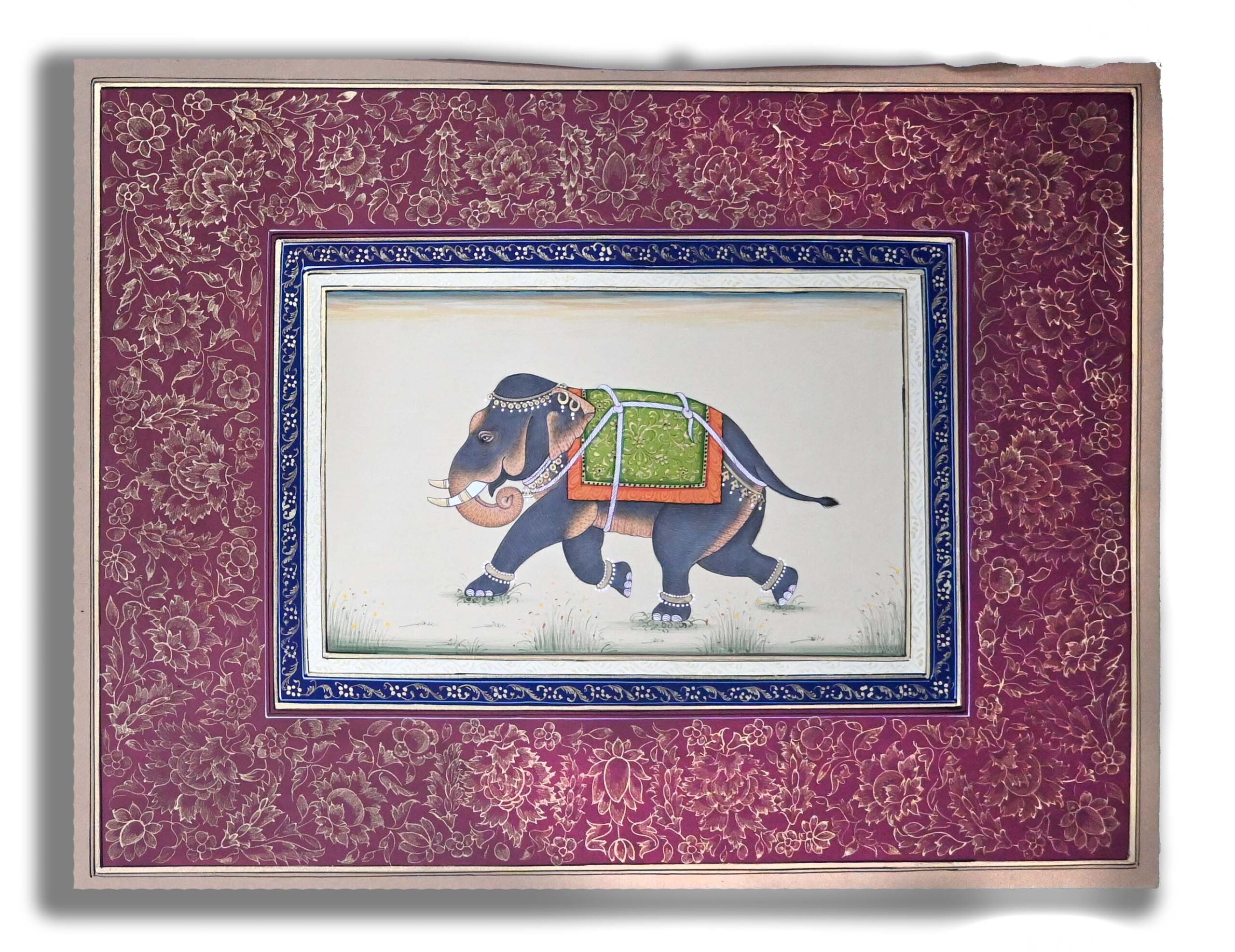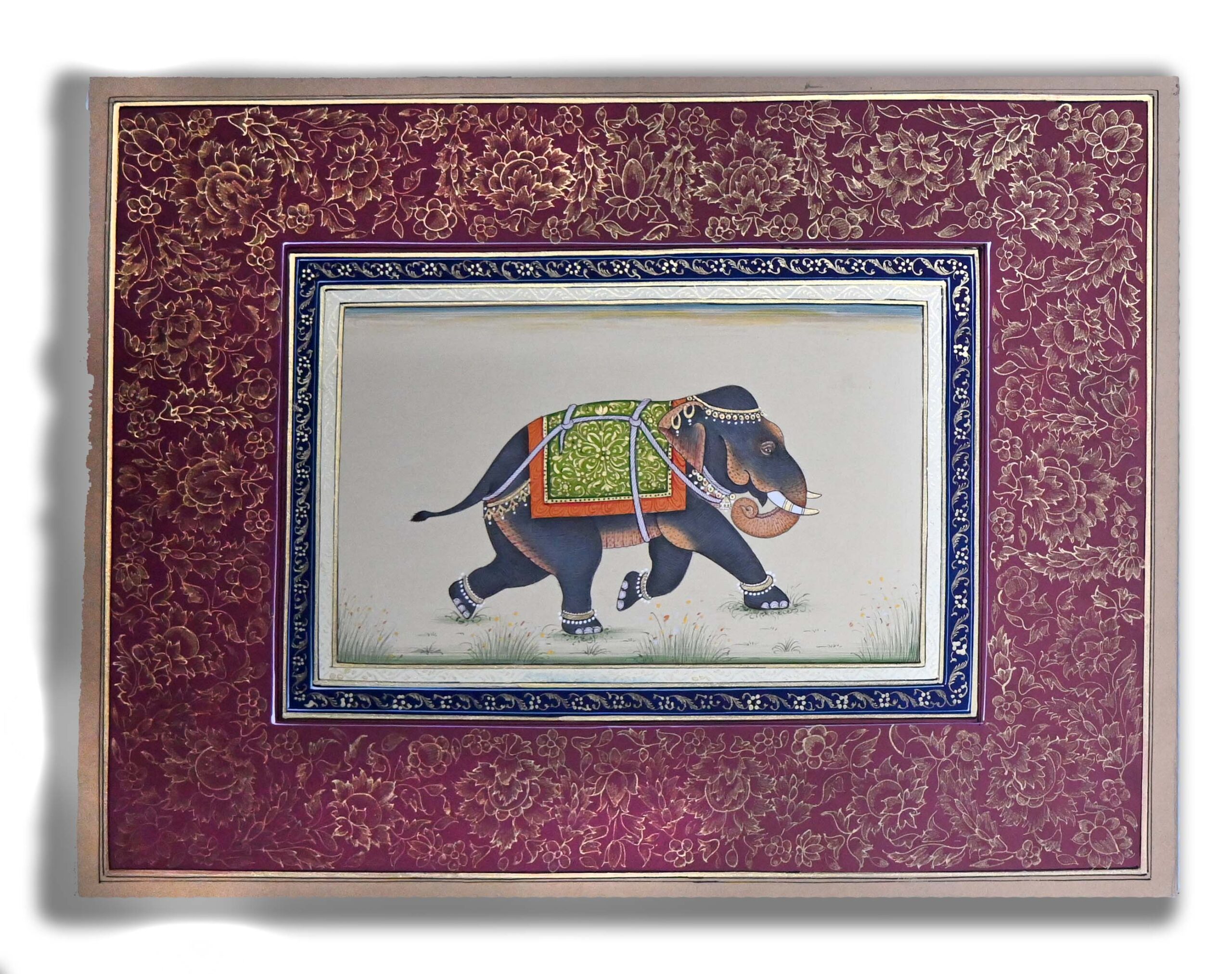 | Express your appreciation for one of nature’s most unique and beautiful animals by adding to your collection this highly detailed and painstakingly hand-painted artwork. Painting made with real gold and with gold floral border.The realistic looking of Indian Well Dressed Wedding Elephant Animal. It is not a print. |