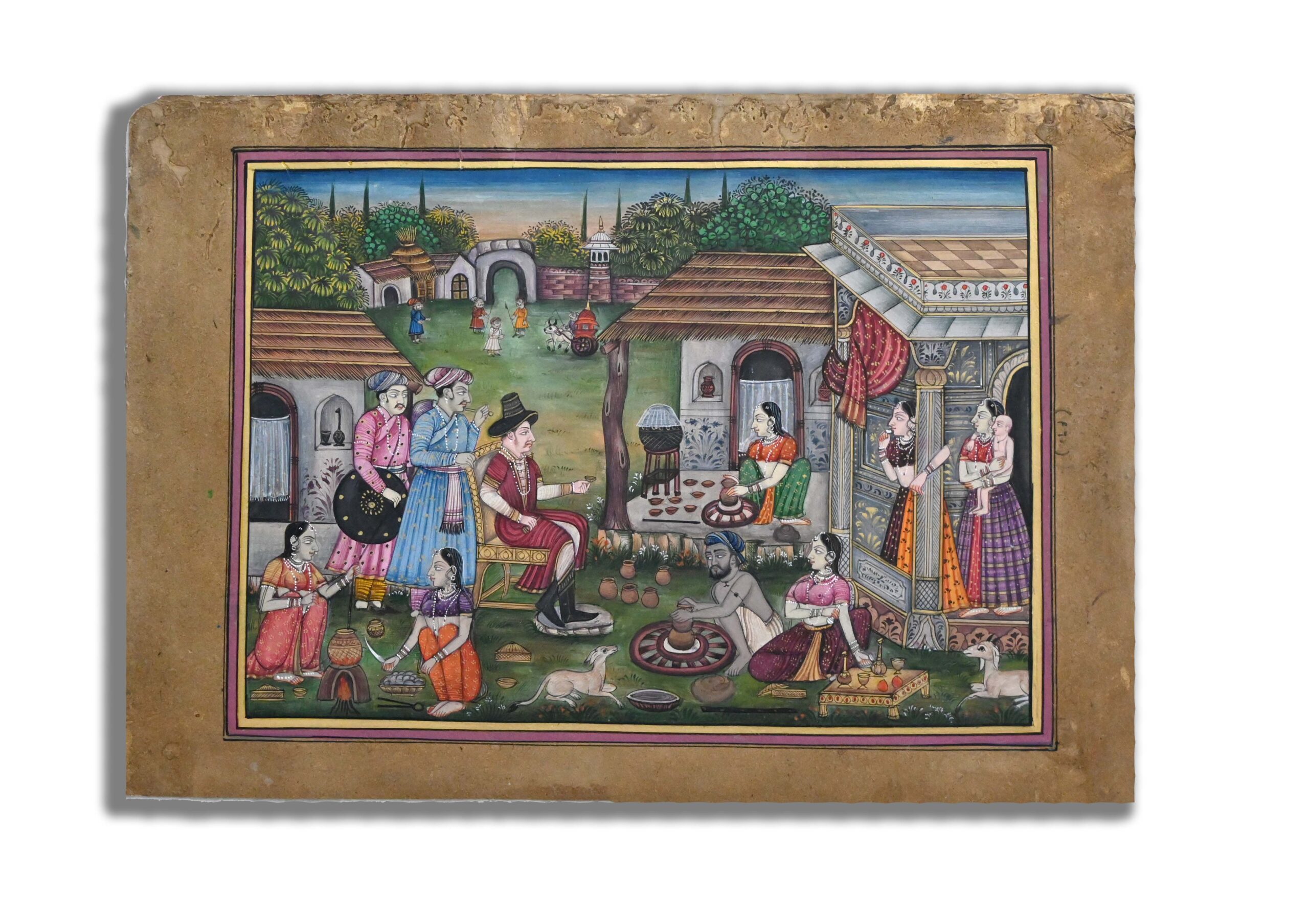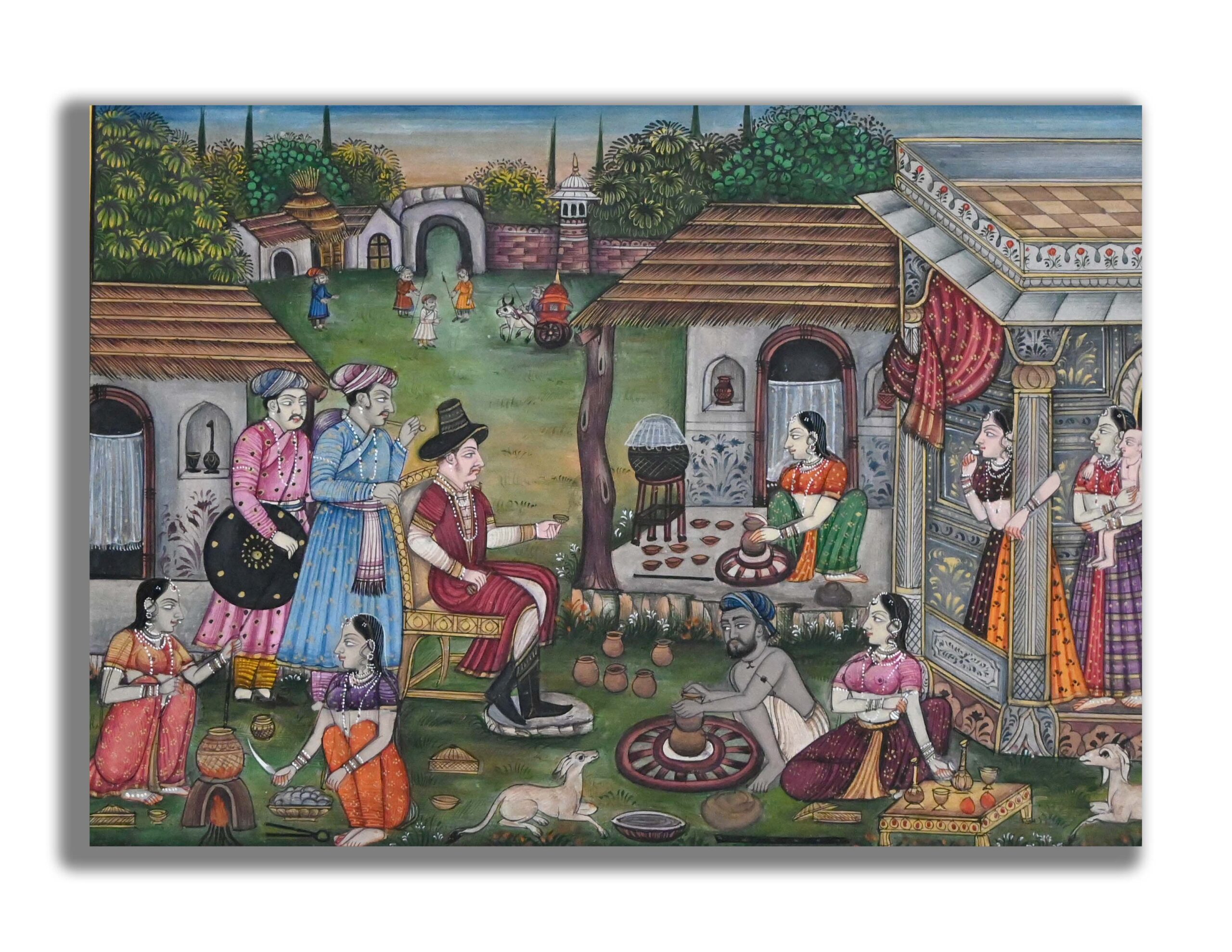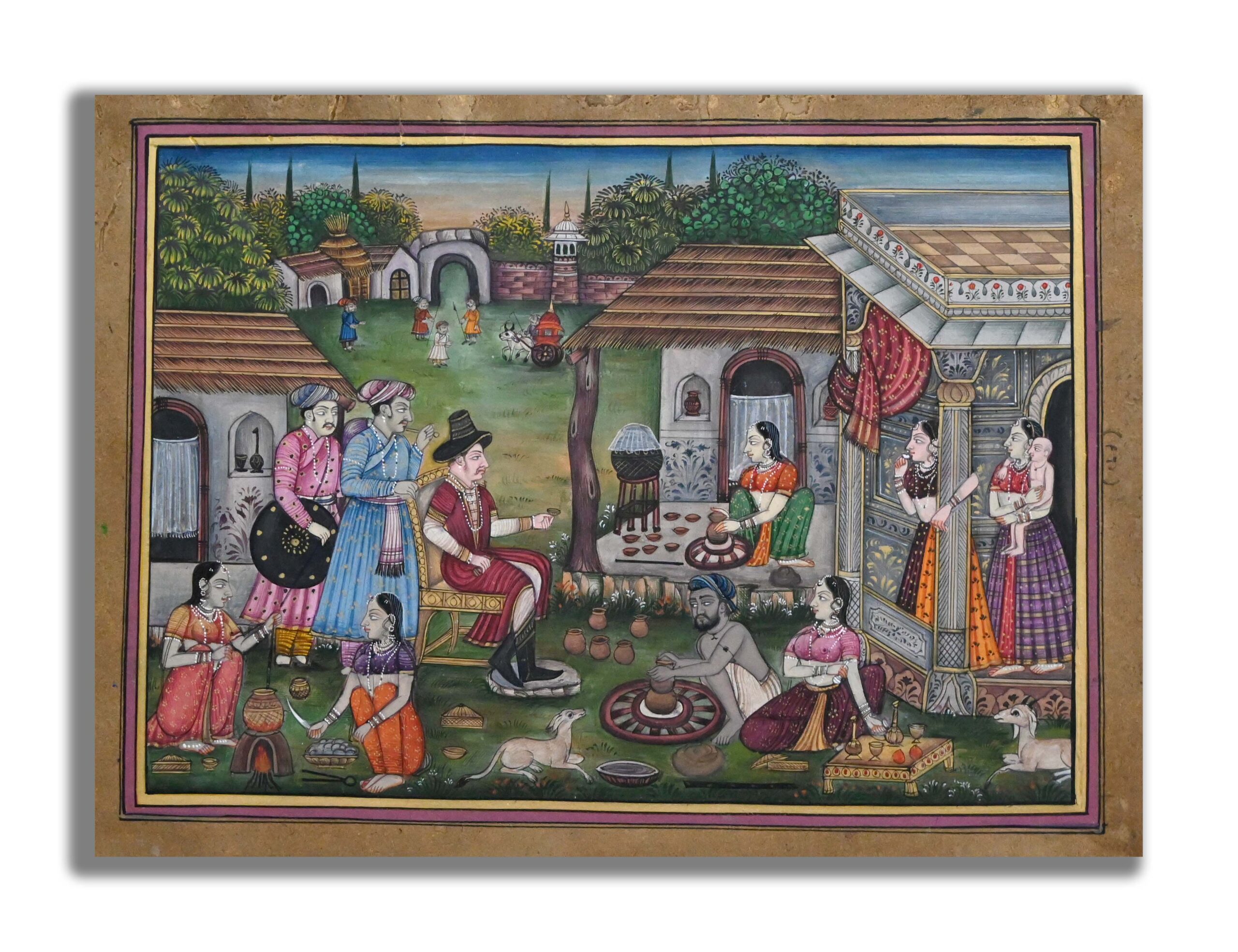 European Visit in Village Scene Painting Handmade Miniature Artwork On Old Paper