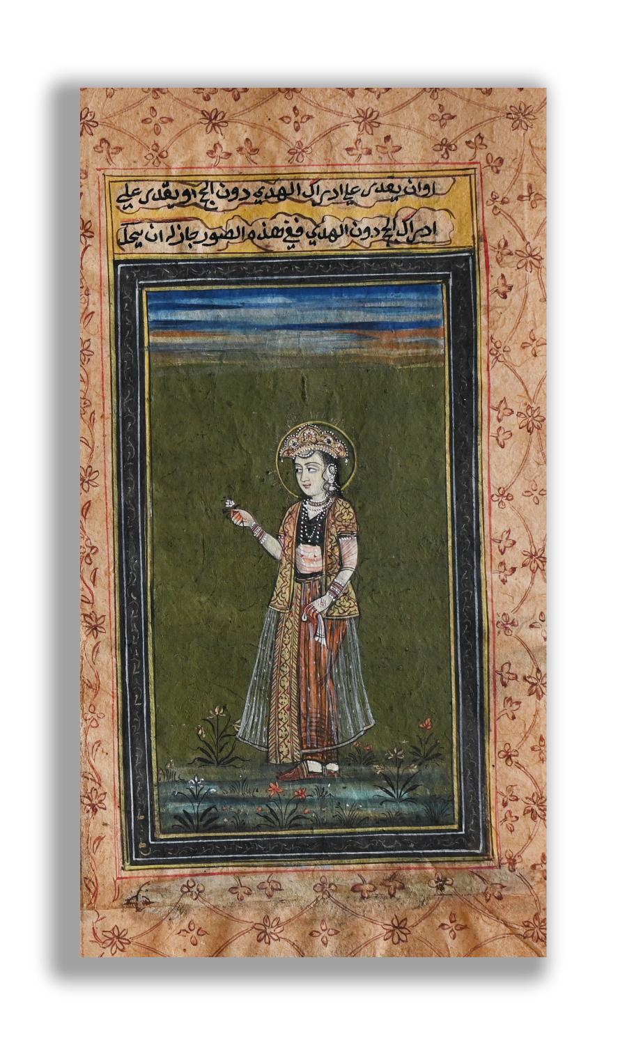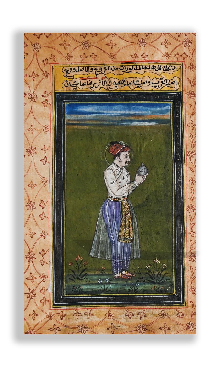 The artwork portrays the 17th century Mughal emperor Jahangir and his empress Nur Jahan in the royal courtyard. The design of this stunning enriched art is enhanced with vivid full colors, creating an unparalleled masterpiece. The handwritten Islamic scripts adds to intrigue and a historical flavor to the painting.