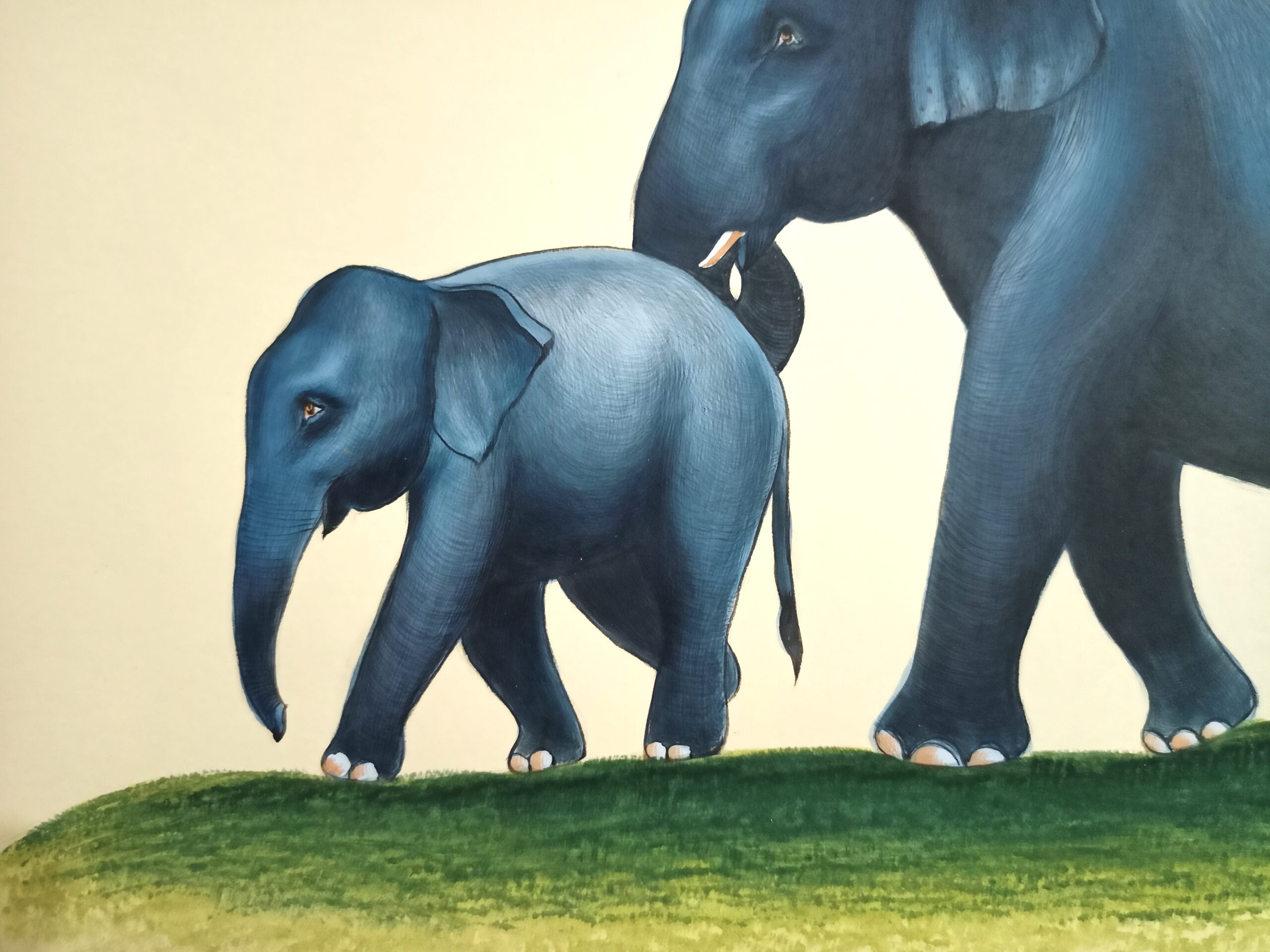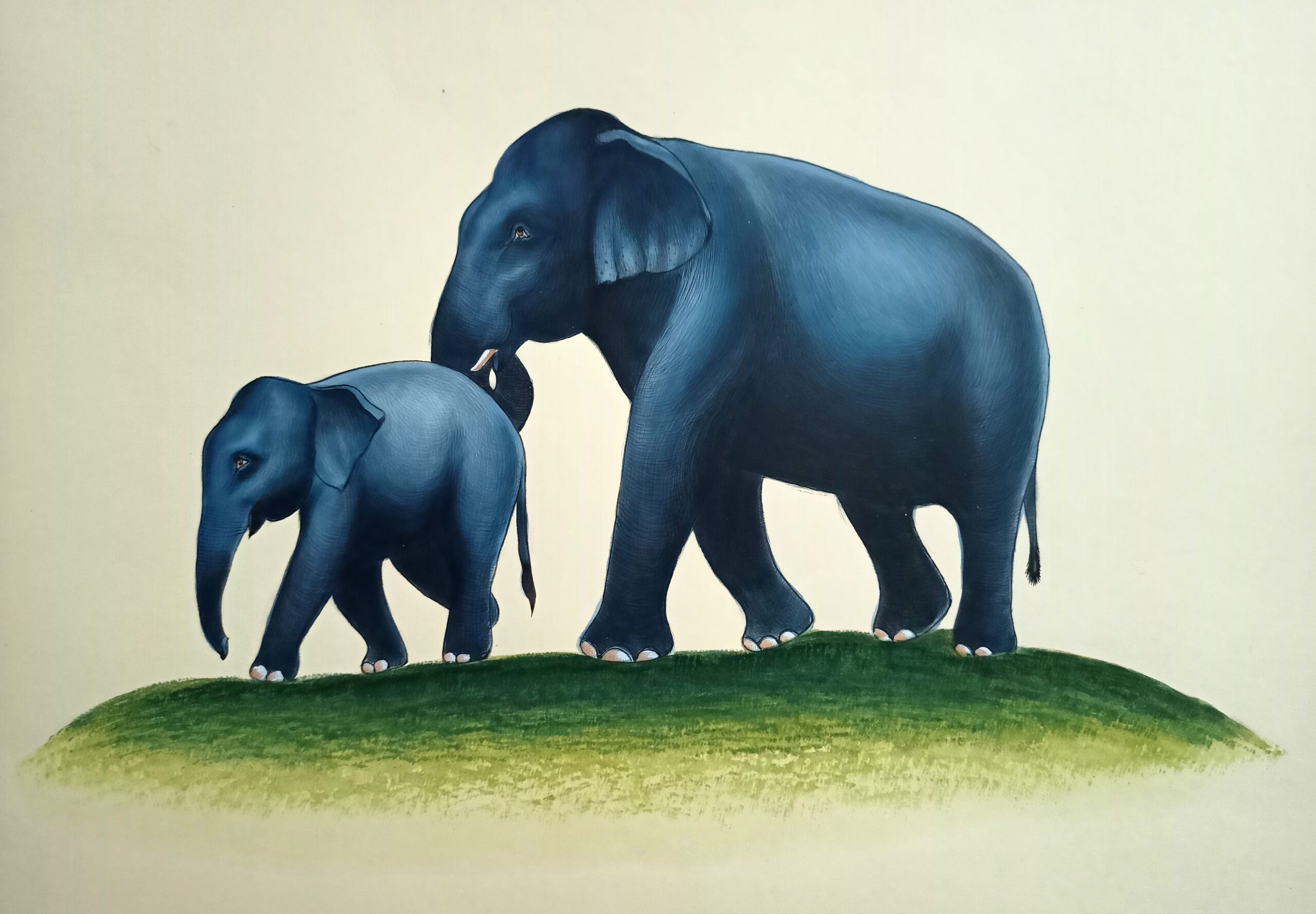 Indian Elephant with Son Animal Realistic Handmade Miniature Painting PN10134