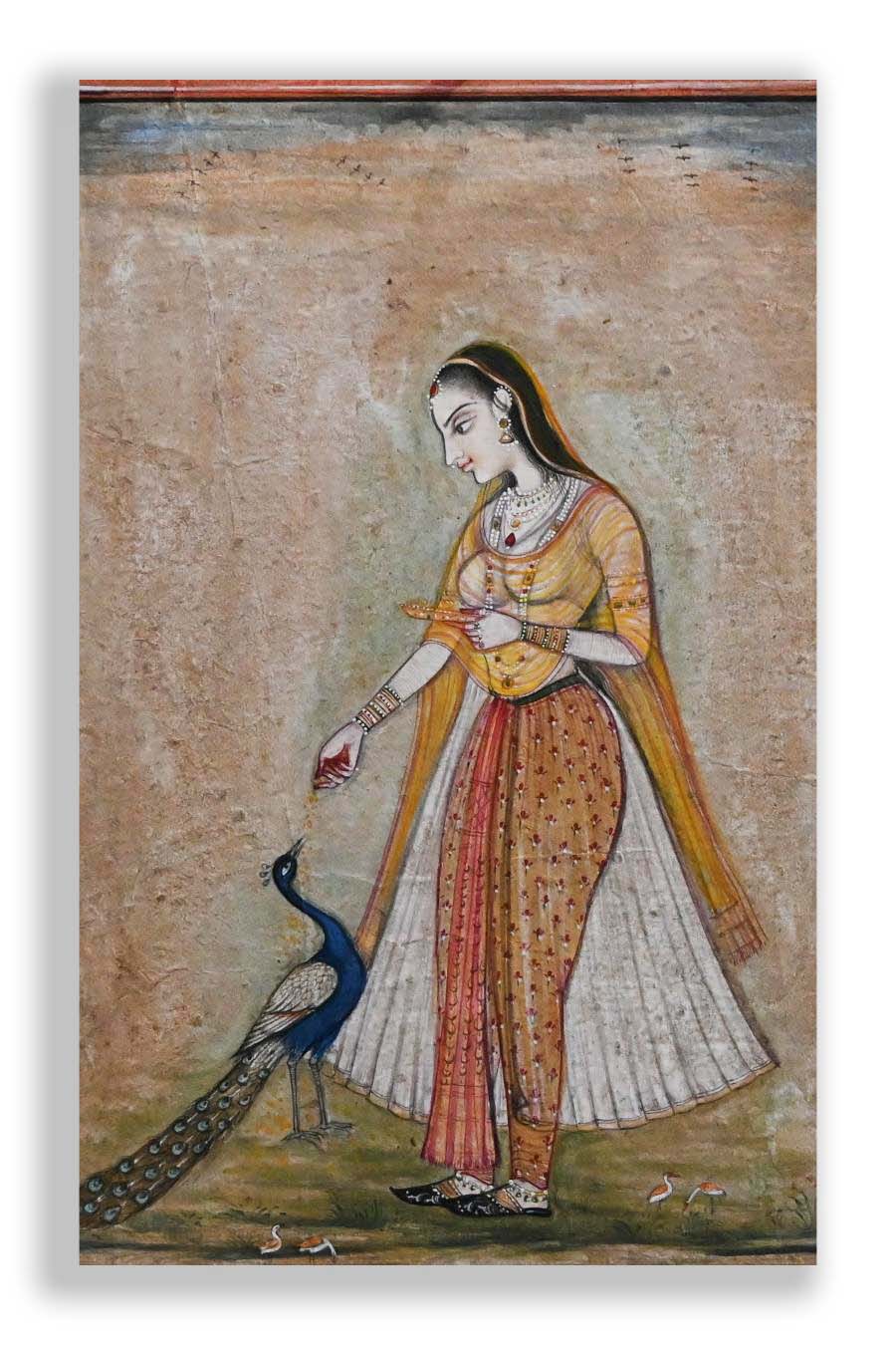 Indian Miniature Jaipur-School Ragni with Peacock Handmade Minatare Painting