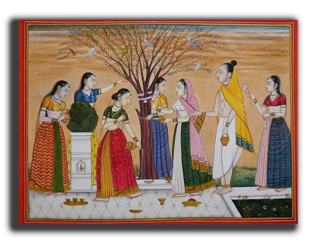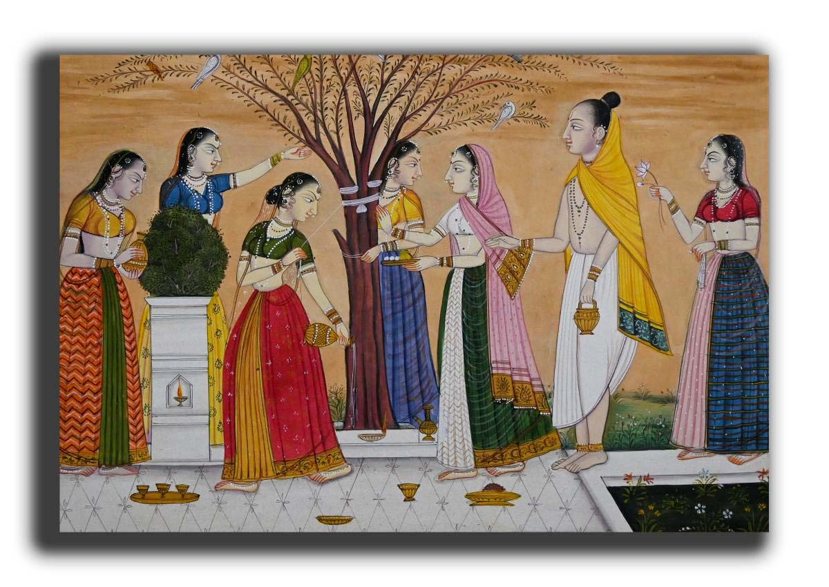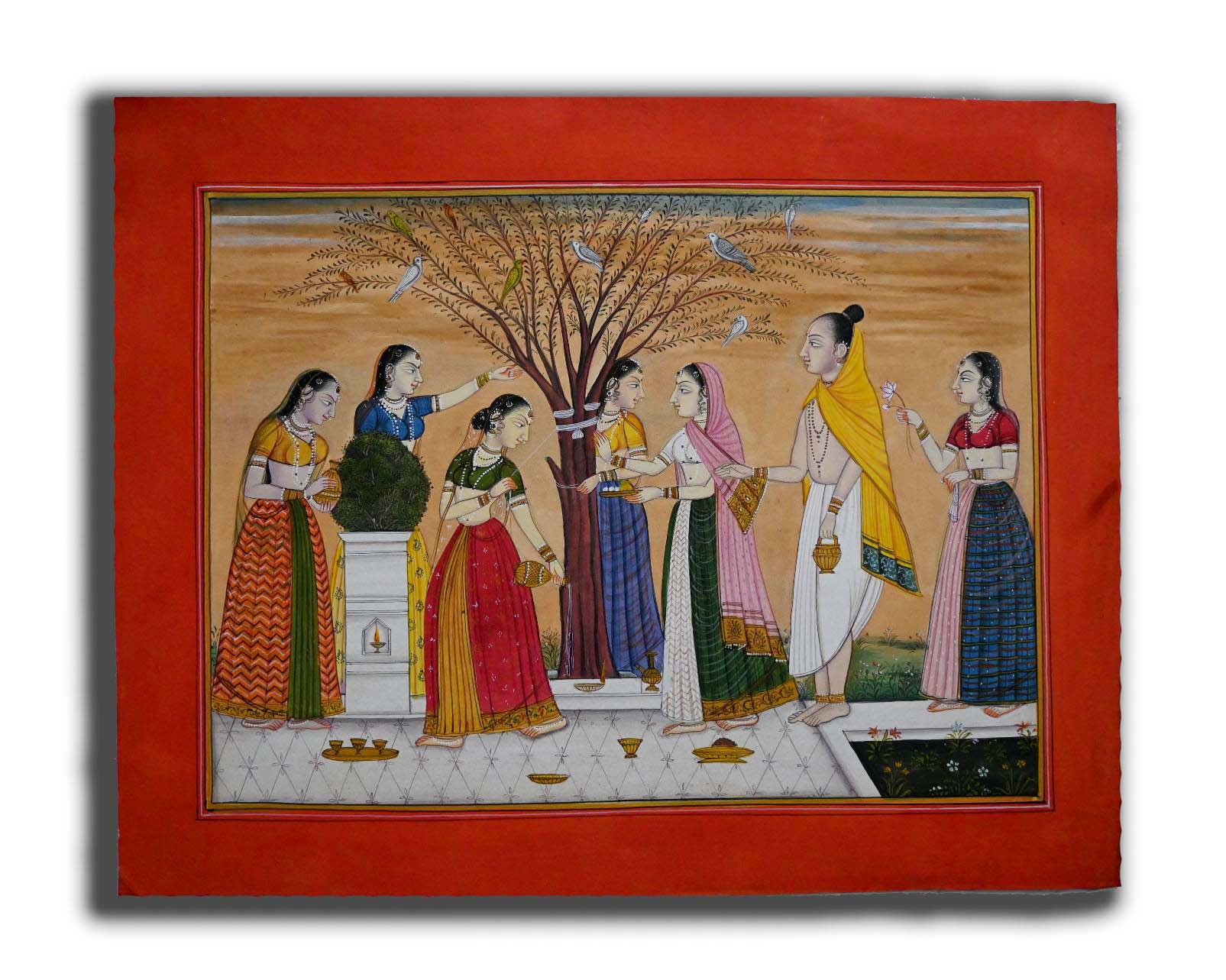 Indian Priest & Women Praying Tulsi Tree Handmade Miniature Painting on Paper