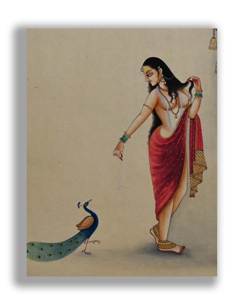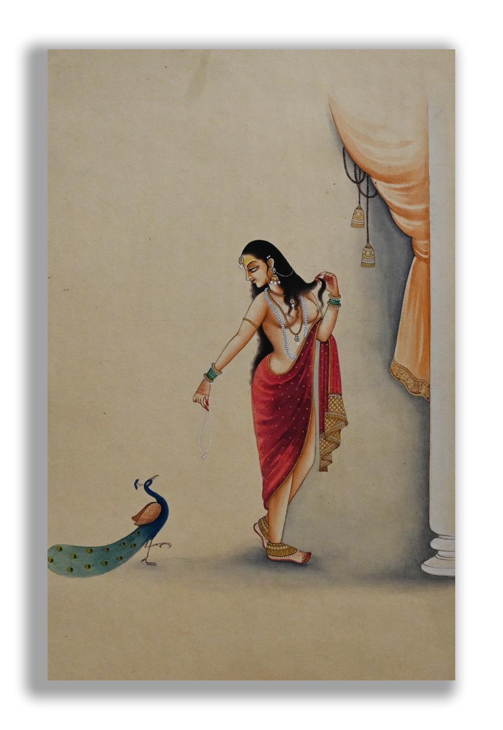 Indian Ragni Semi Nude Miniature Portrait Handmade Painting with Peacock