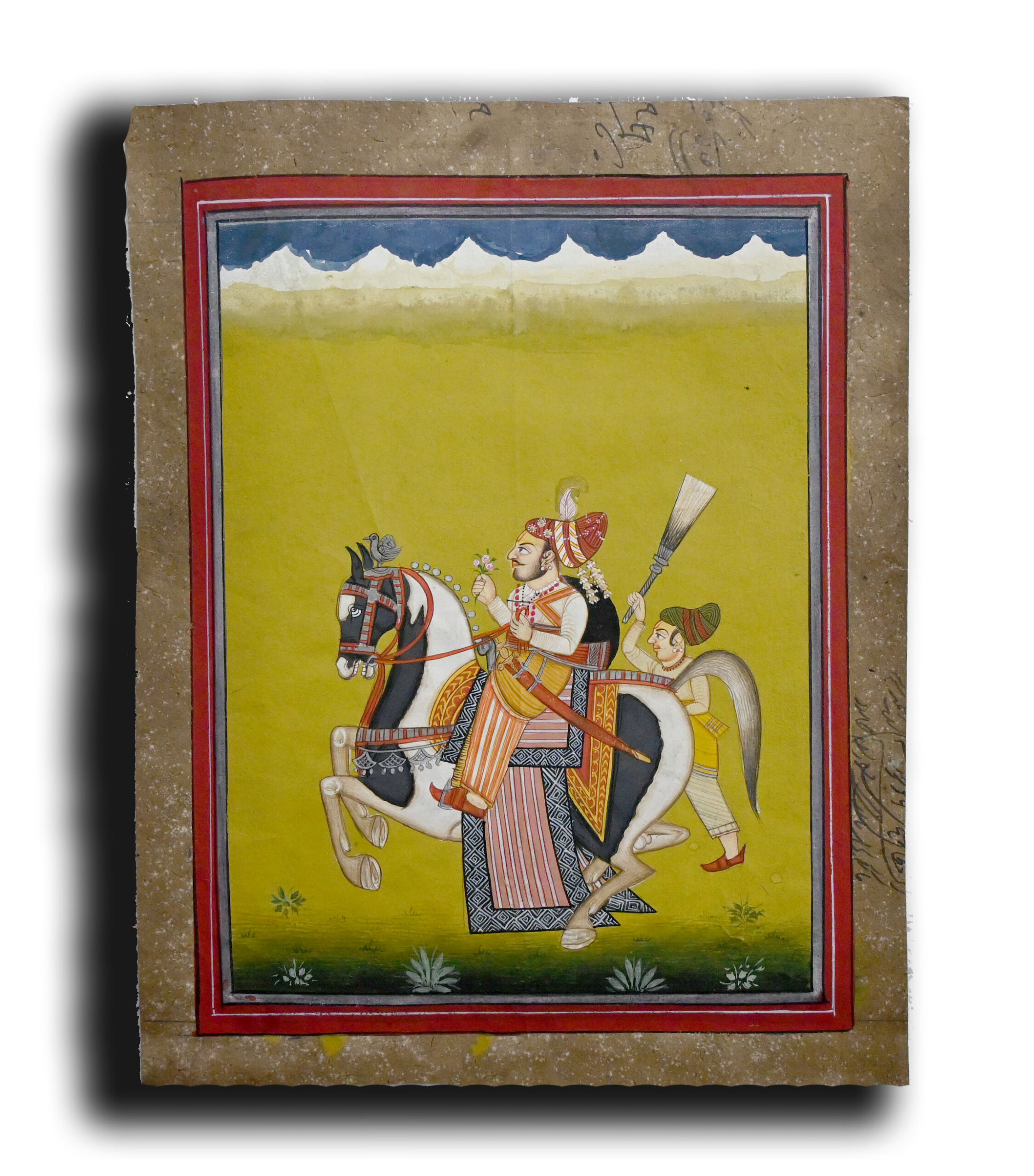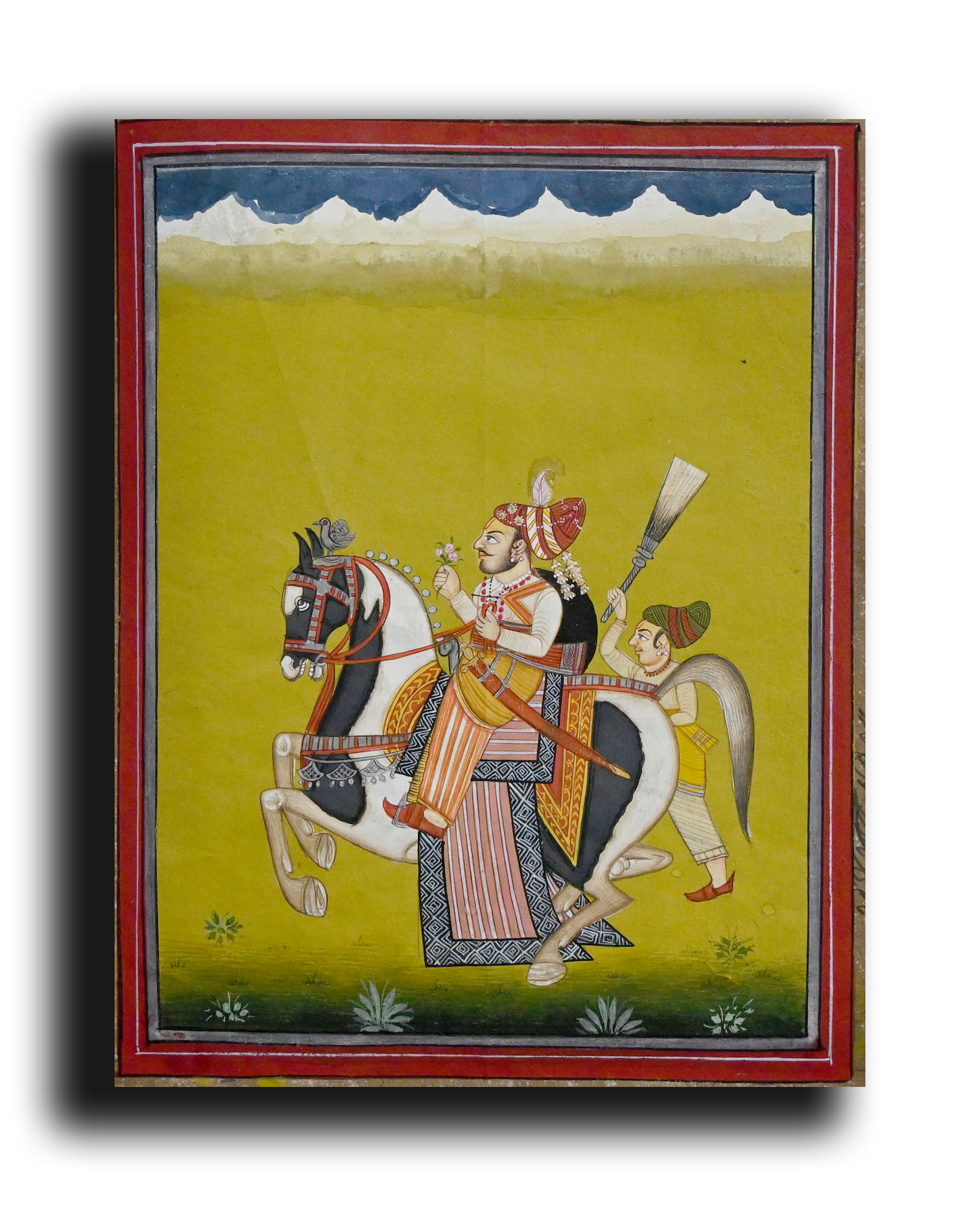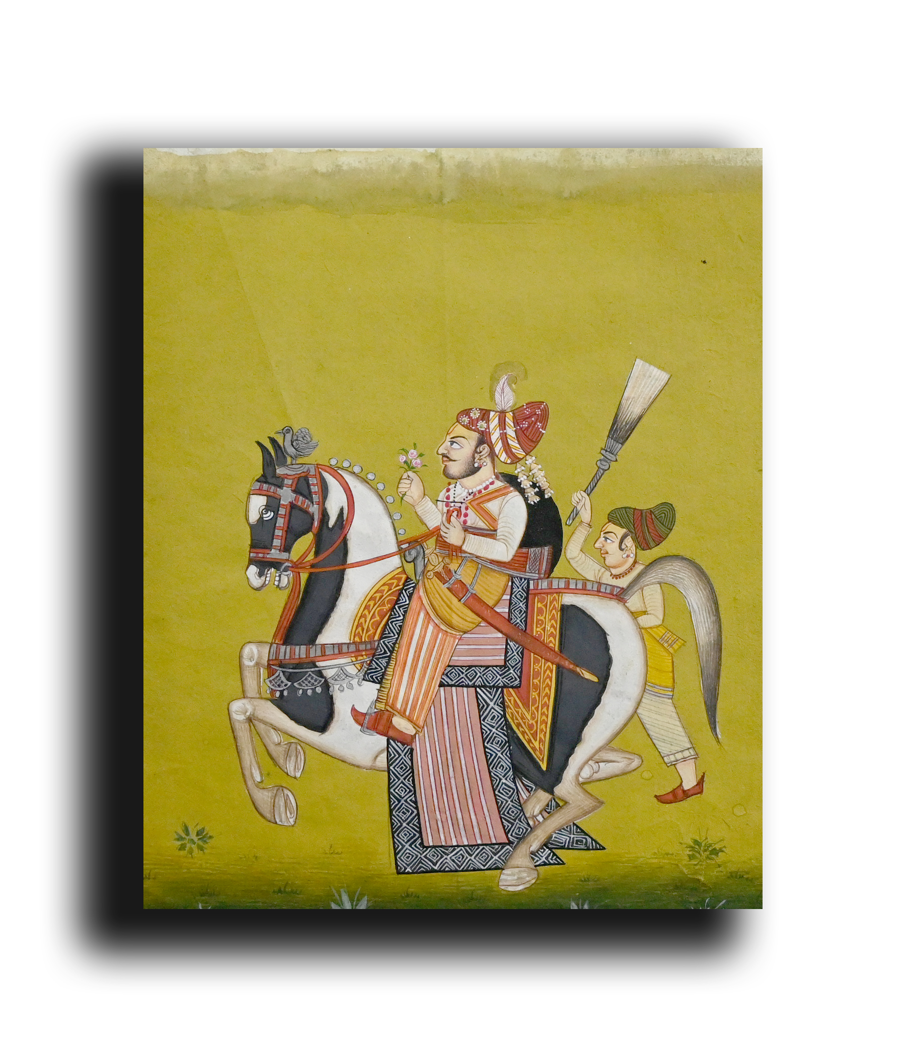 - The Unparalleled Classic Portrait Art Brings Out The Graceful And Romantic Lifestyles Of The Maharajas (Kings). It Features The Ruler Proudly Riding His Richly Adorned Horse. His High Status Is Shown By The Bright Halo, Sophisticated Turban, His Many Necklaces & Rich Garment, And The Attendant Who Carries The Fly Whisk For Him.