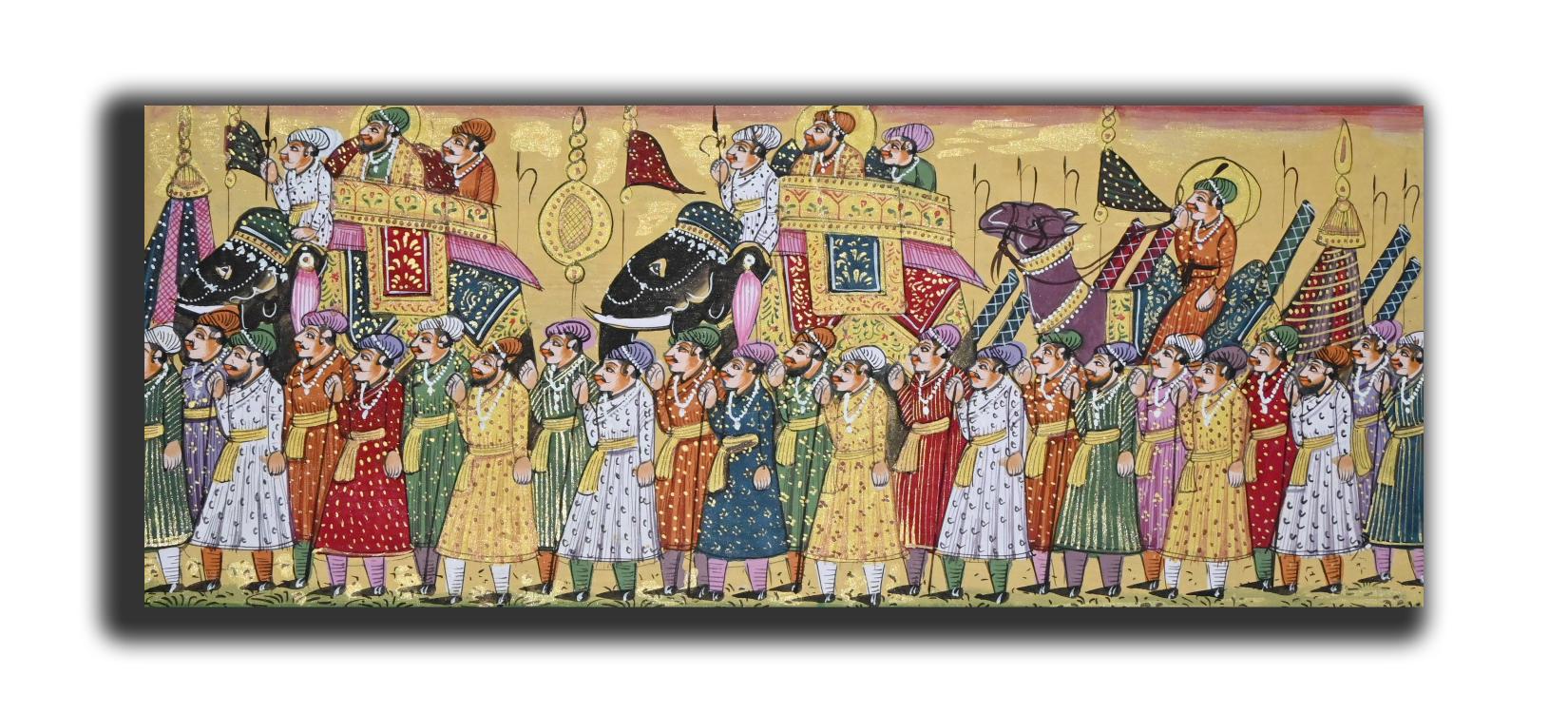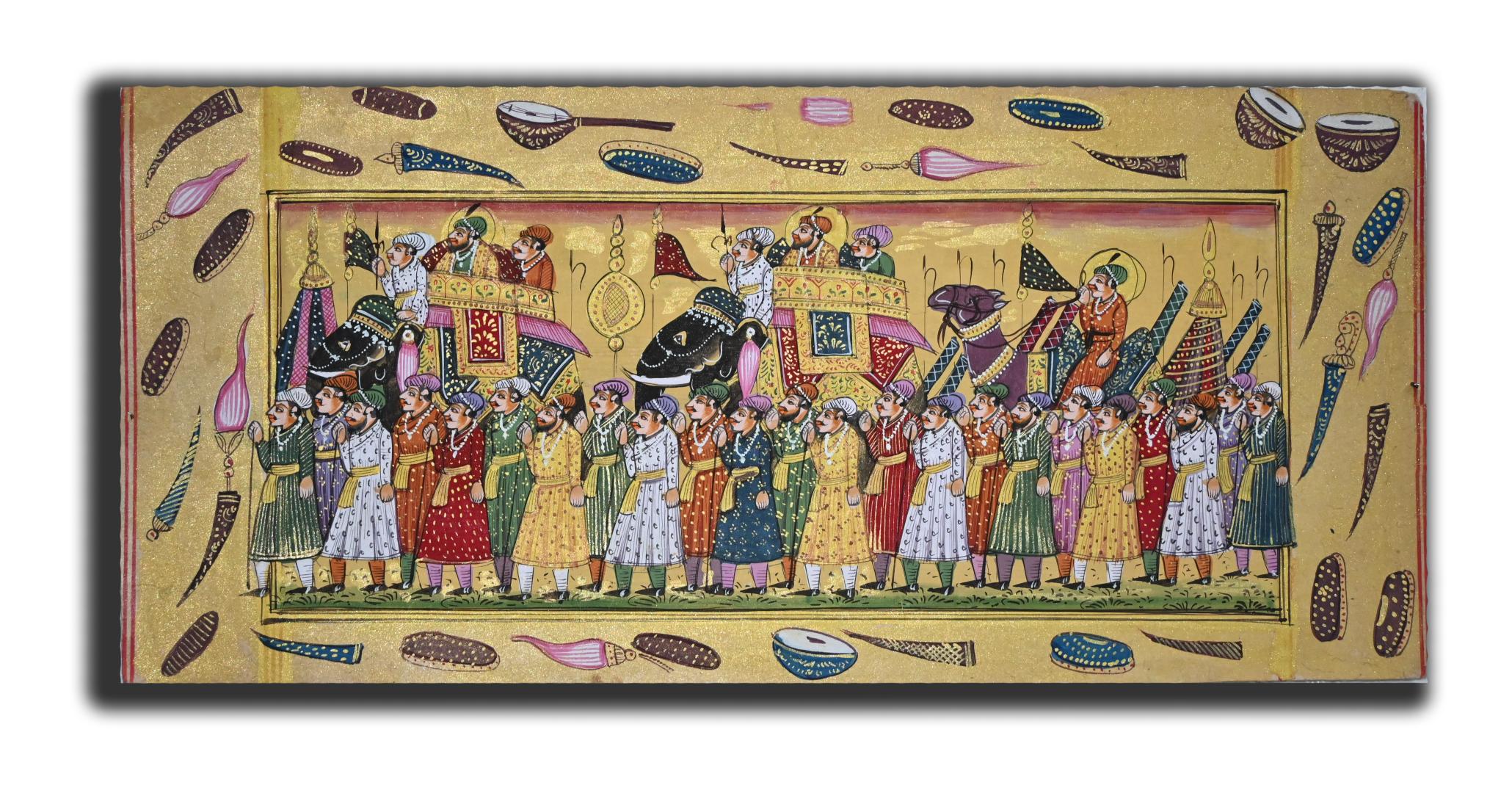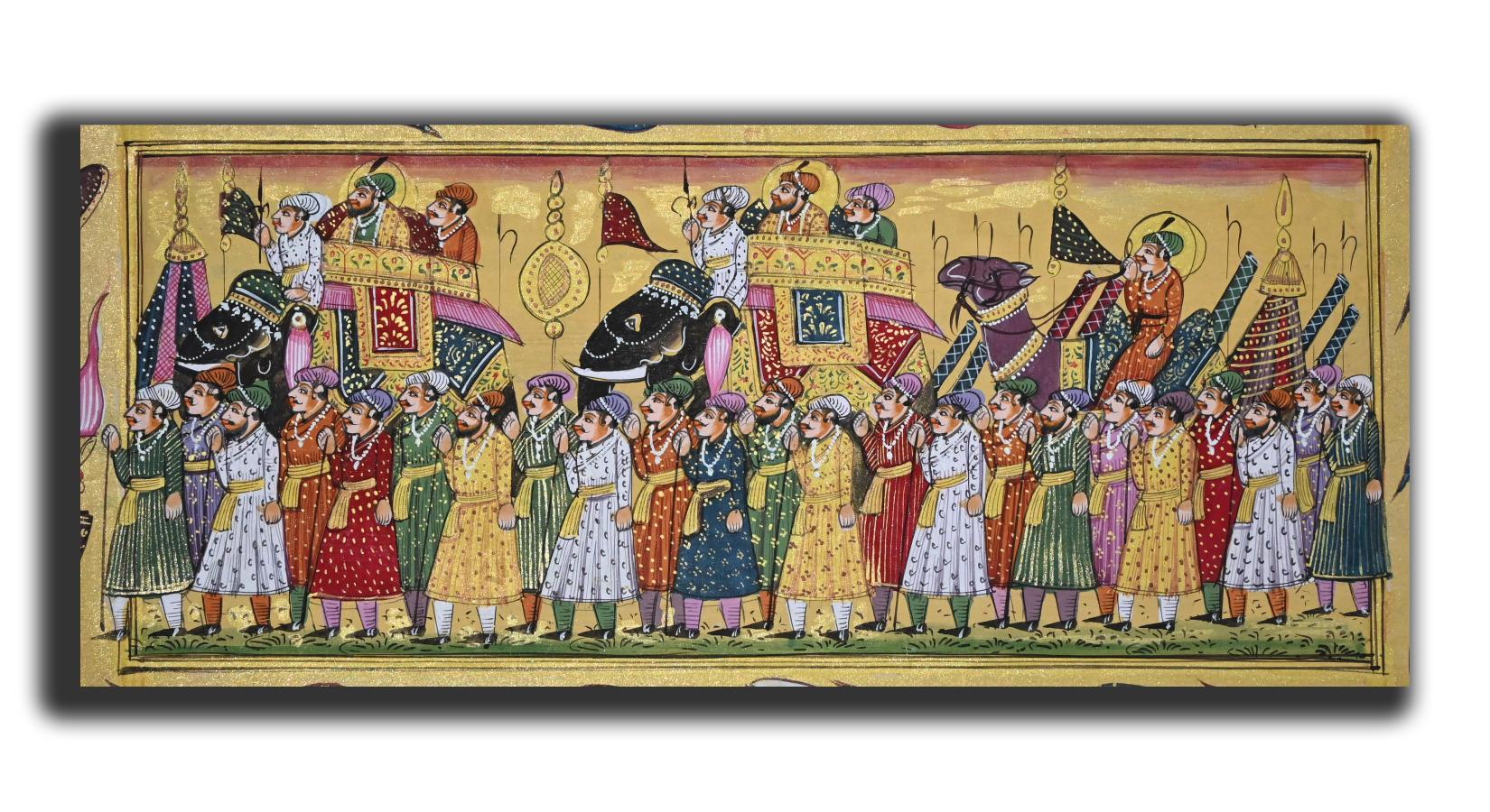 - You Love These Beautiful Handmade Painting On Old Sanskrit Paper These Painting Shows When The Maharajah Go With Their Friend And With Maharani On Procession With Beautiful Elephant Which Complete Well Rajasthani Dress With Their Attendant With Well Dress.