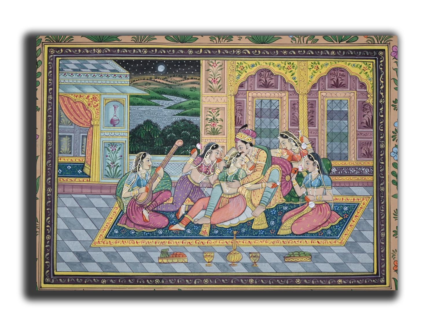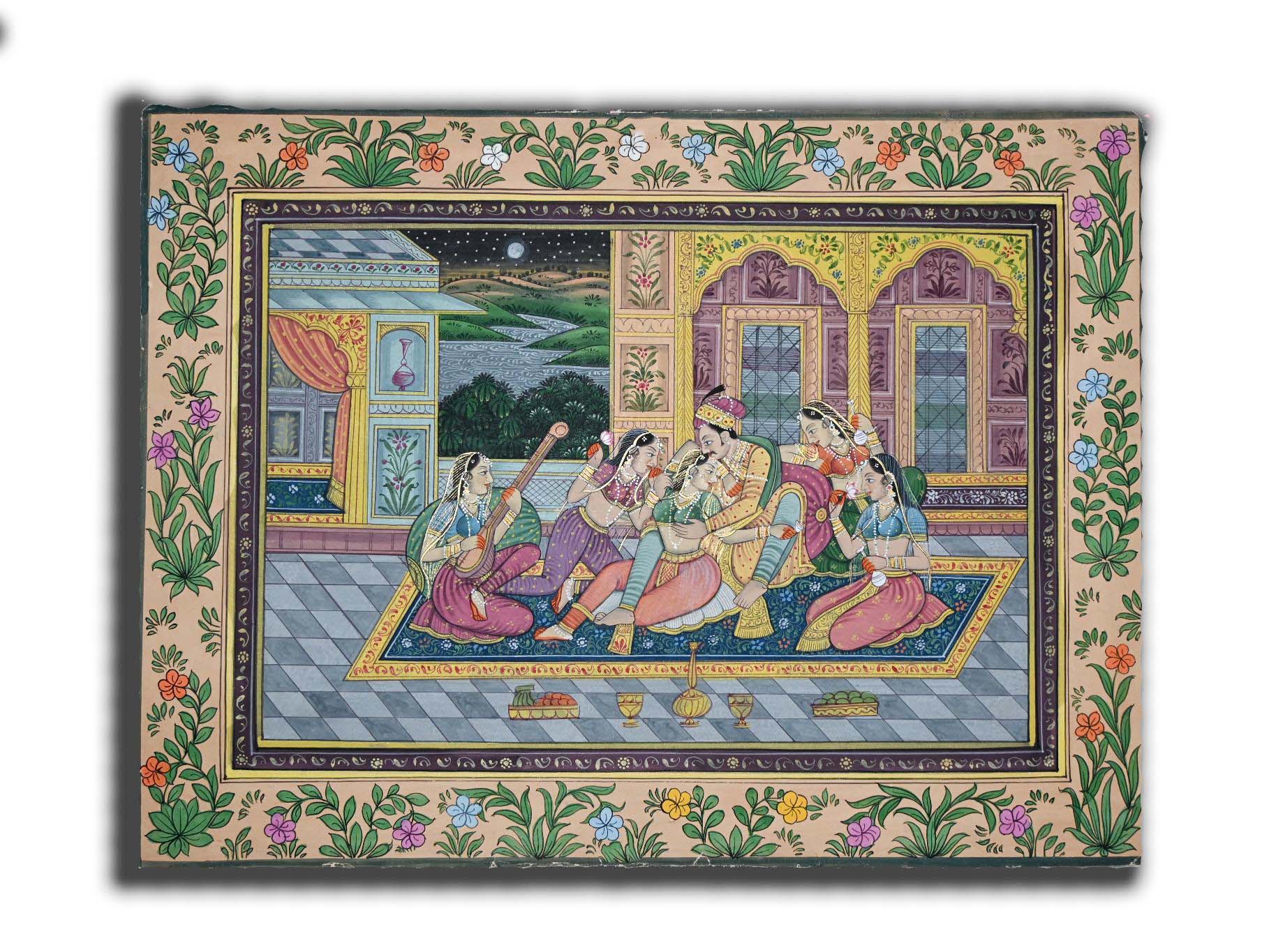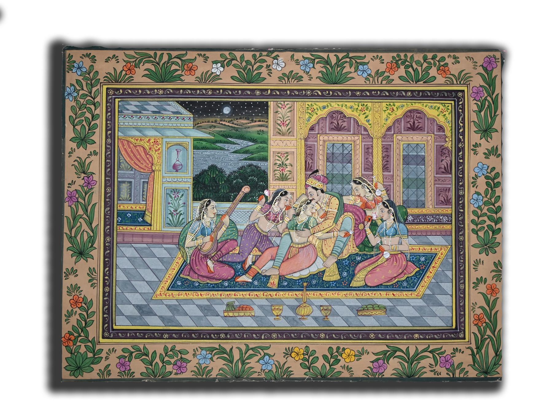 Moghul Badshah Doing Harem with Damsels Painting Handmade with Floral Border