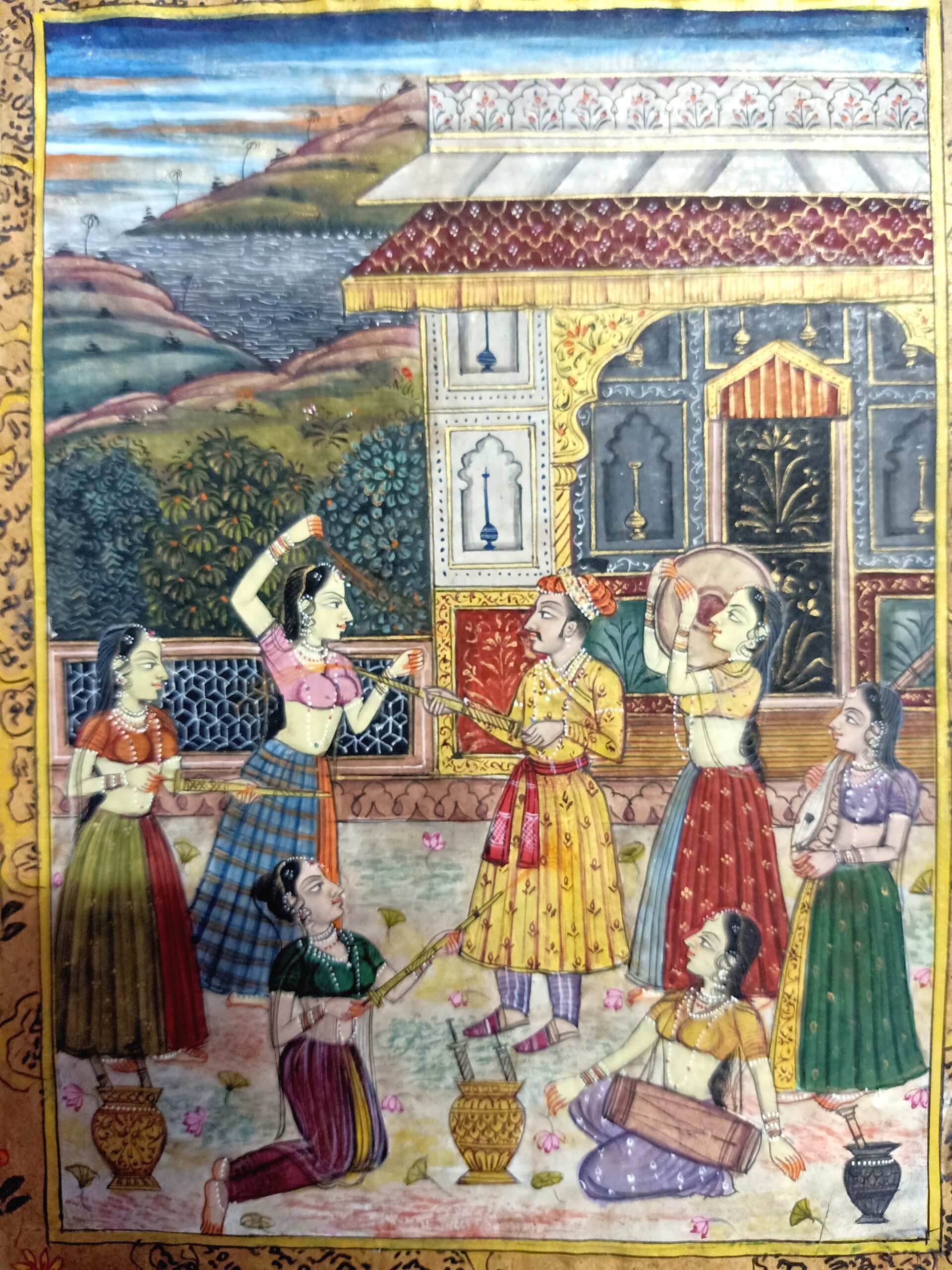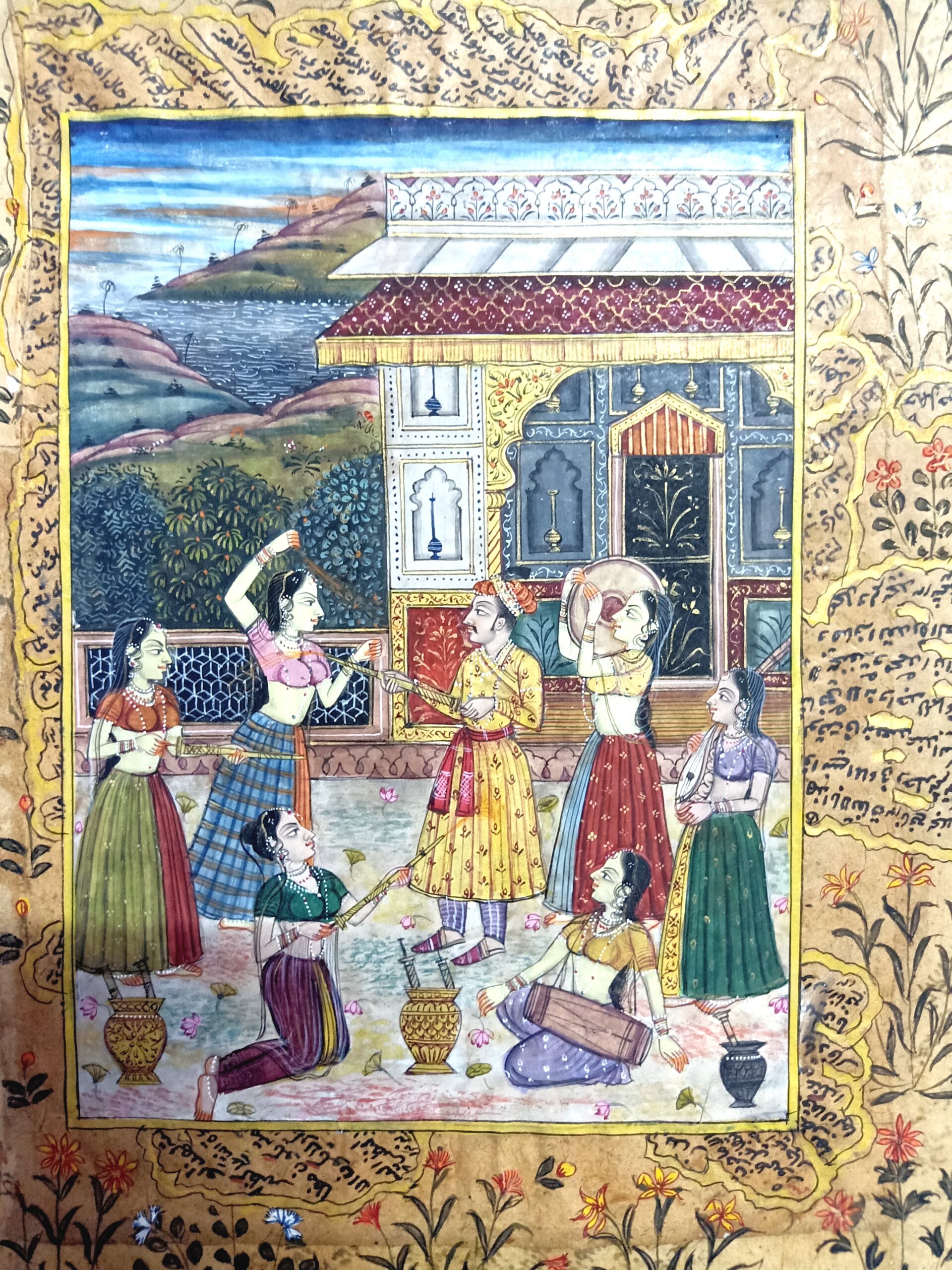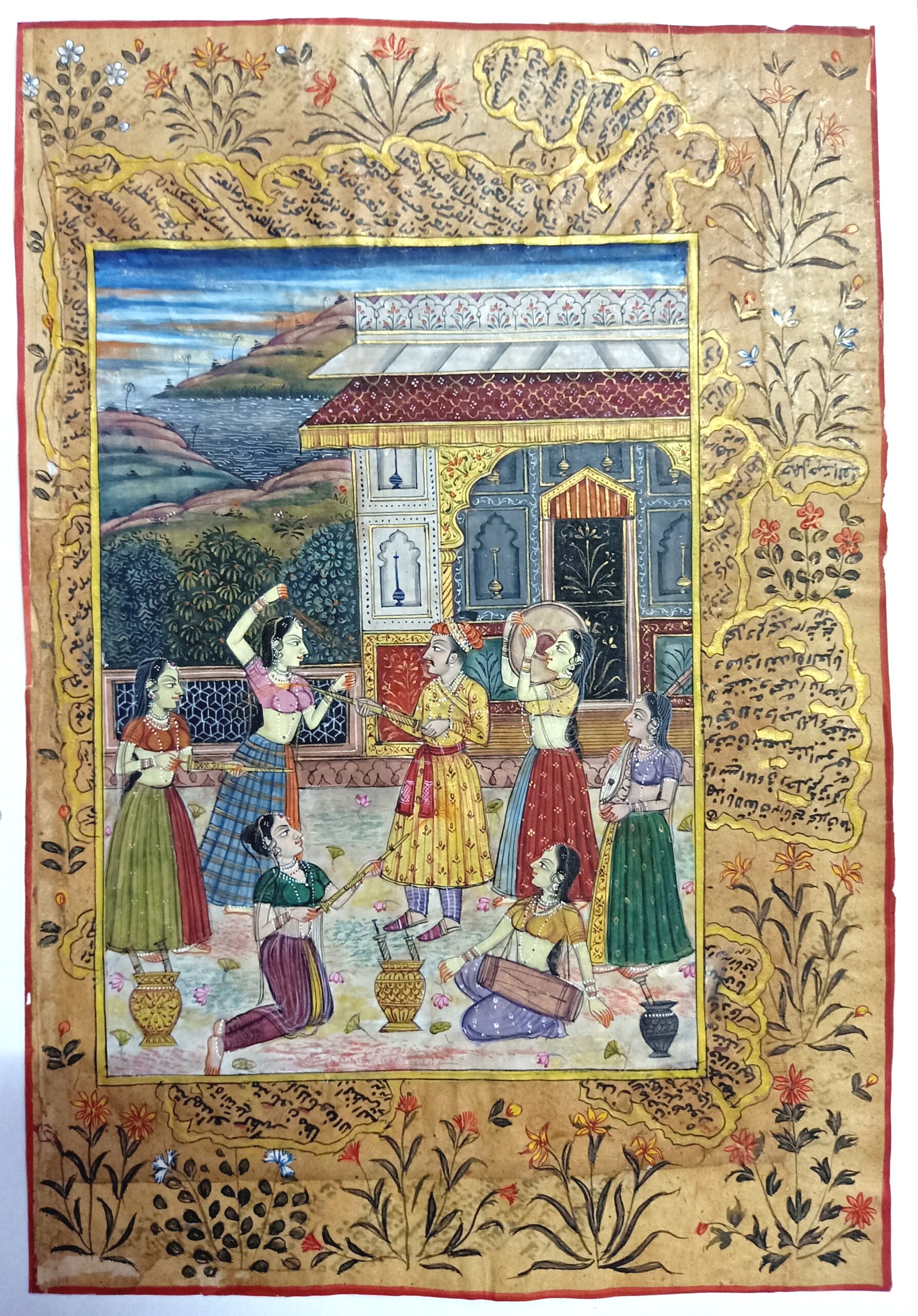 Moghul Badshah Playing Holi with Begum & Damsels Miniature Painting On Old Paper