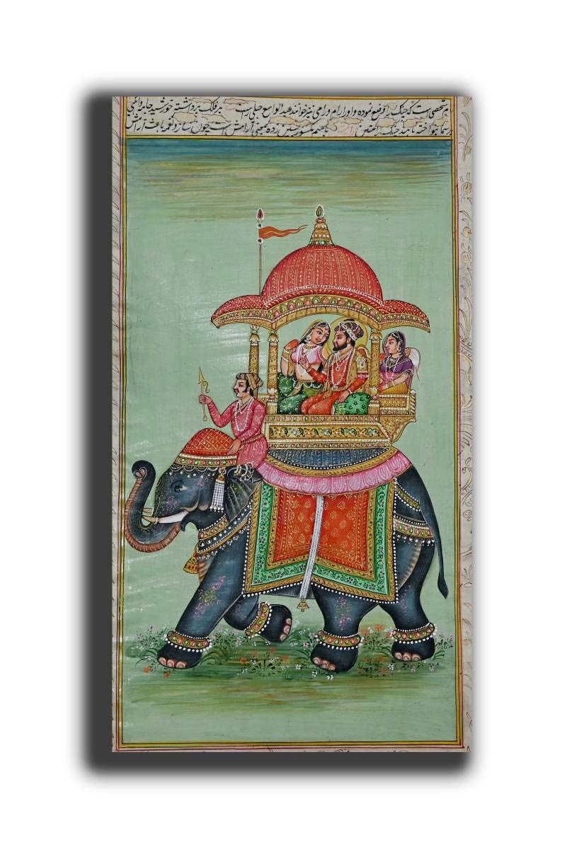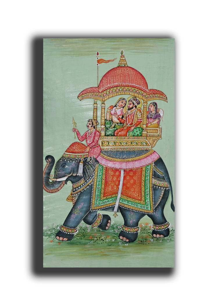 Mughal Badshah & Begum Riding Elephant Miniature Painting 13.5 x 8 In “PN10145”