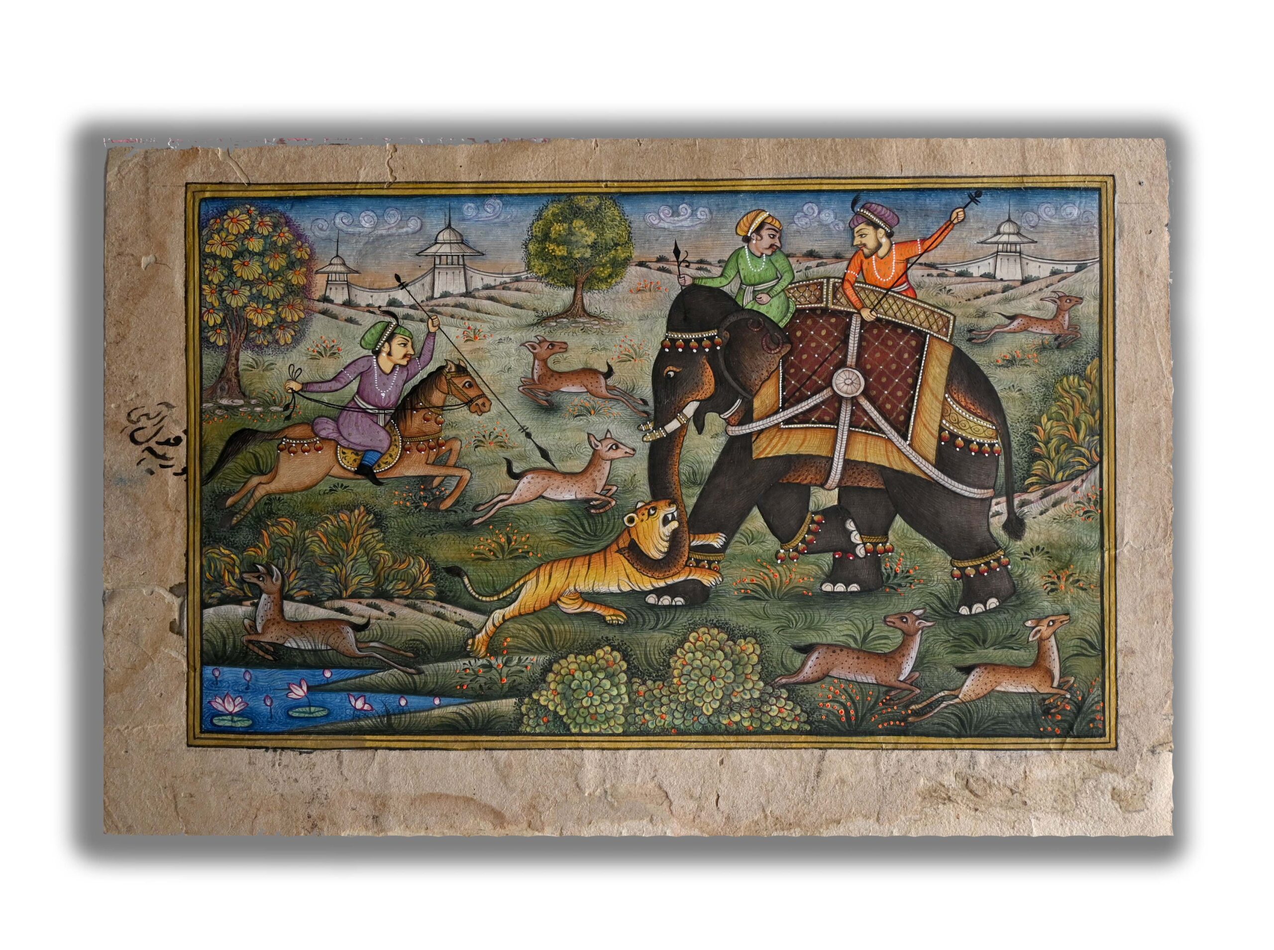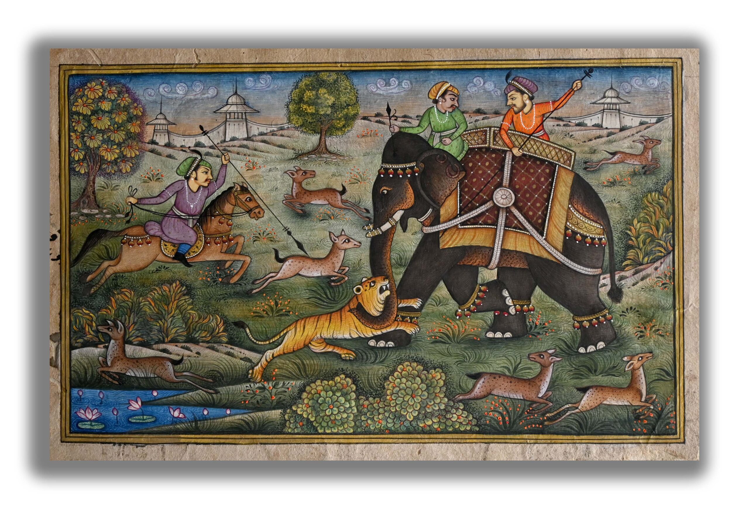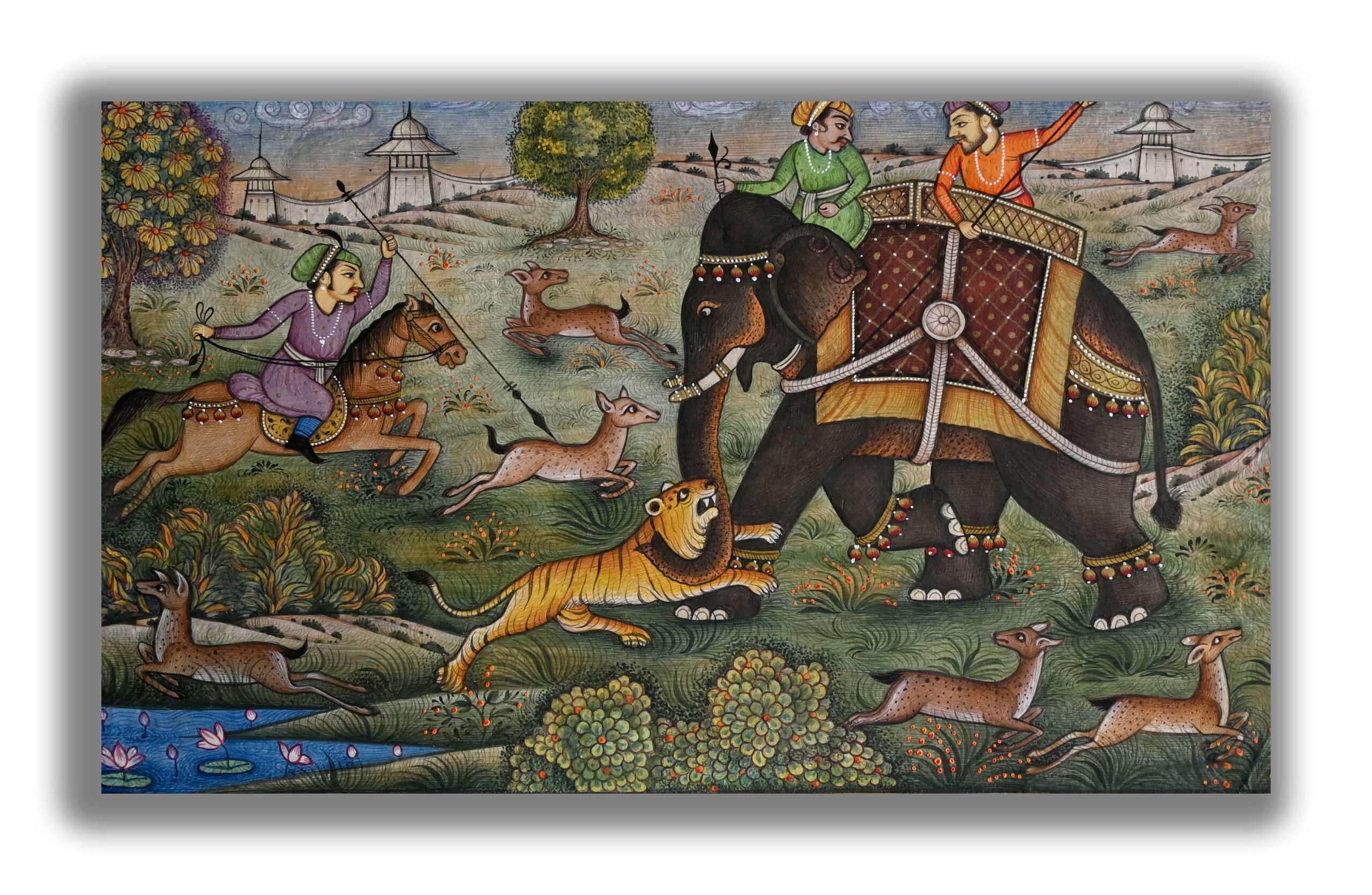Mughal Badshah Deer Animal Hunt Dotted Work Handmade Fine Miniature Painting