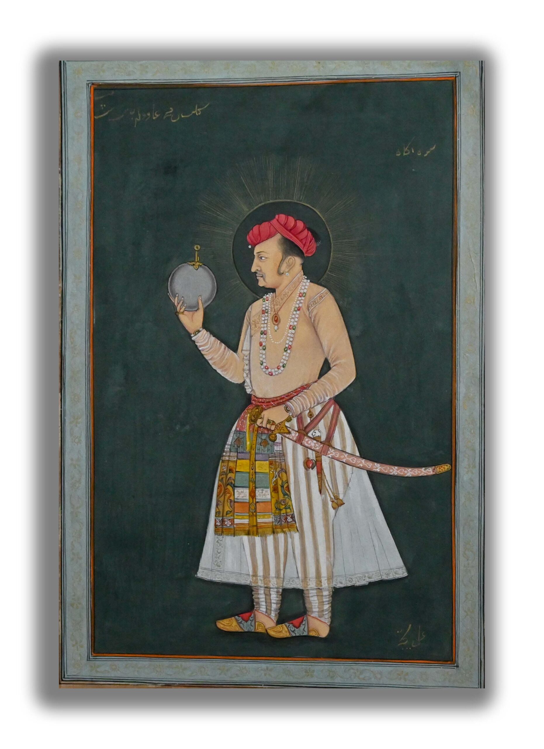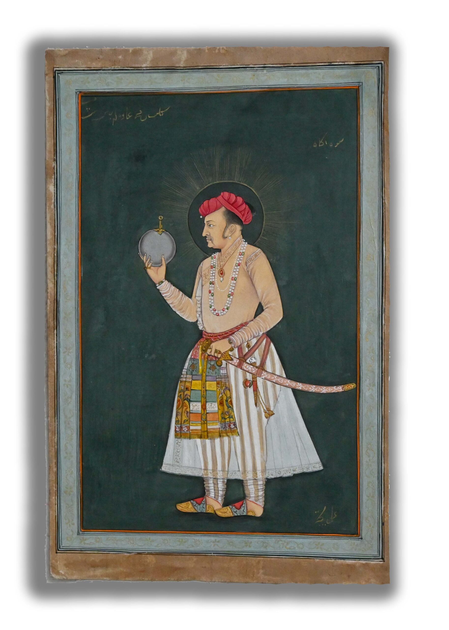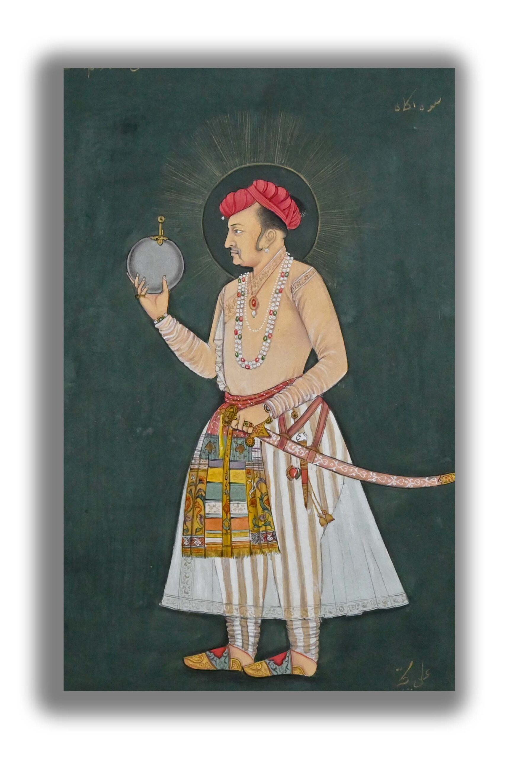 The Padshah Jahangir holding the globe of universe in his hand and having a sharp sword and wearing dashing cloth.