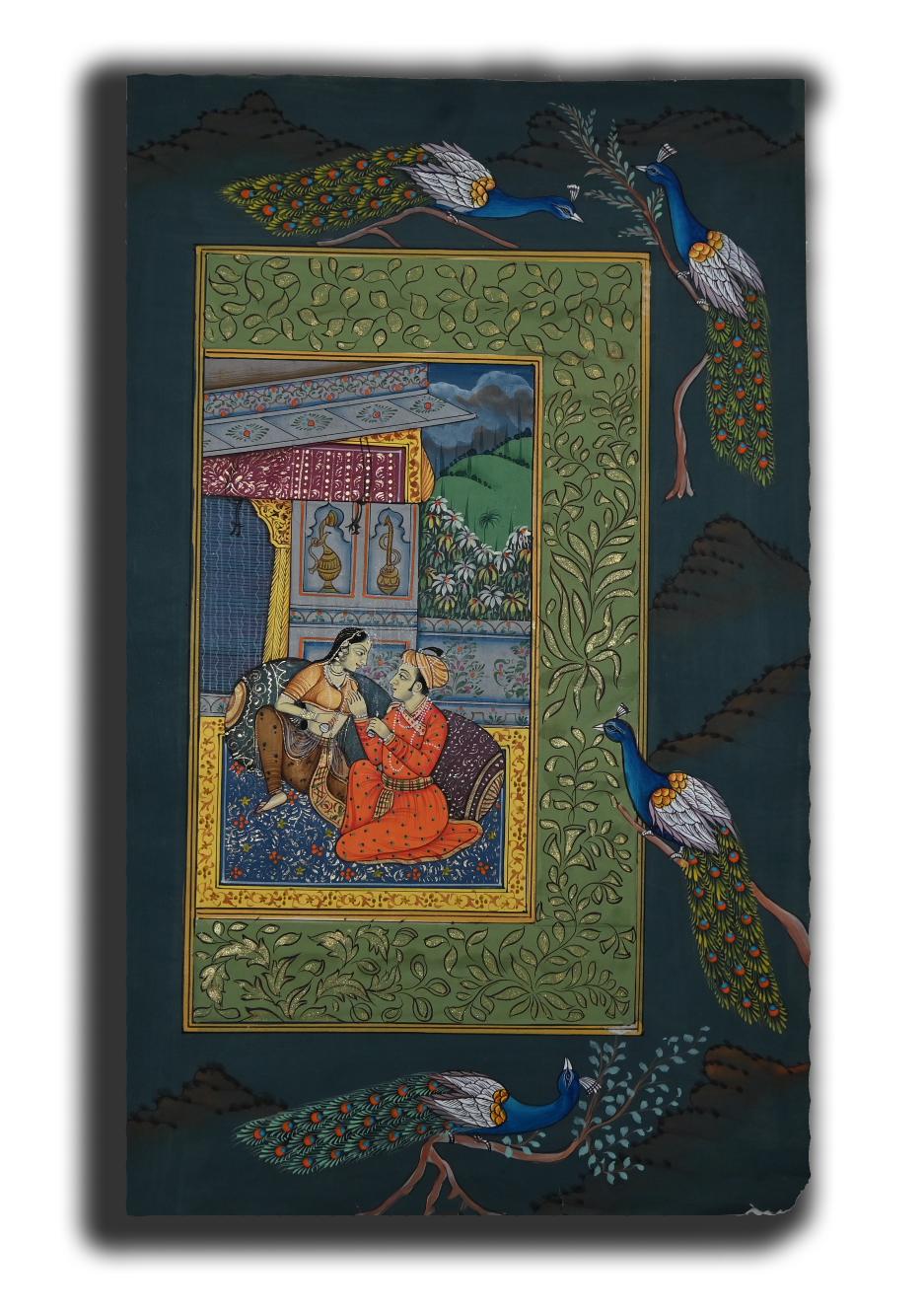 Mughal Prince Harem Painting Handmade Miniature Artwork With Peacock Border