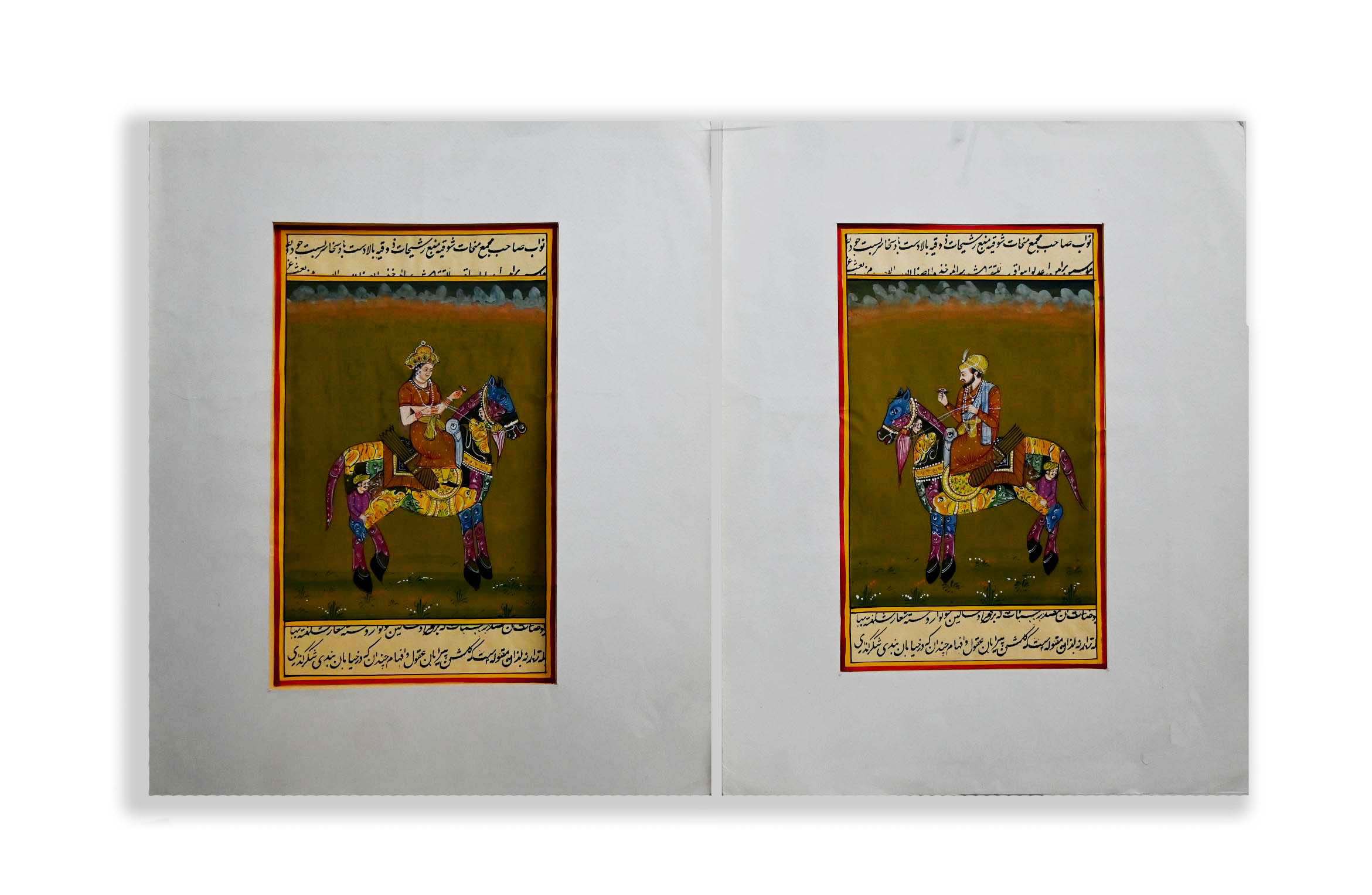 Pair of Mughal Badshah & Begum Riding Composite Animal Painting Wall Decor Art
