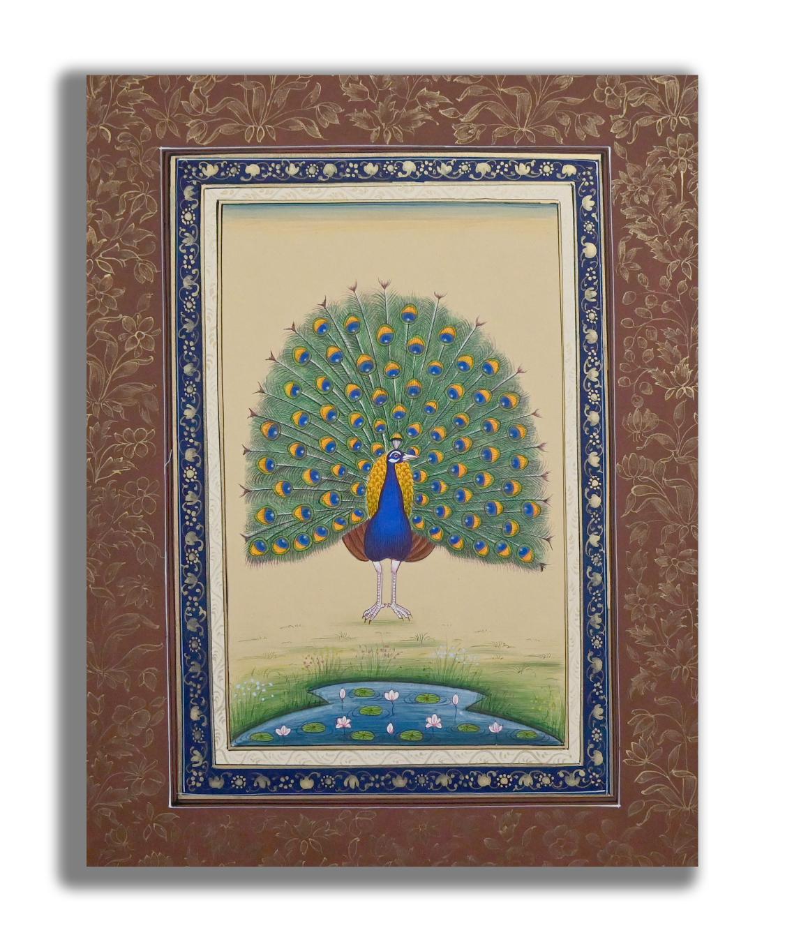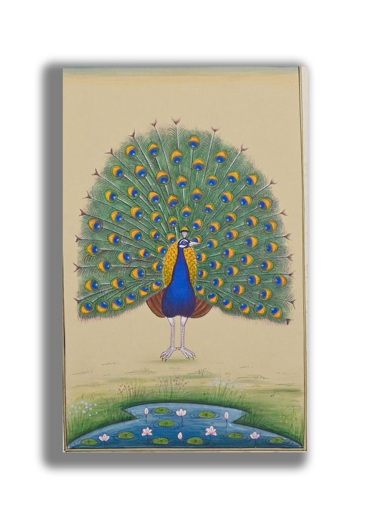 Peacock Bird Peafowl Handmade Miniature with Gold Leaf Bird Miniature Painting