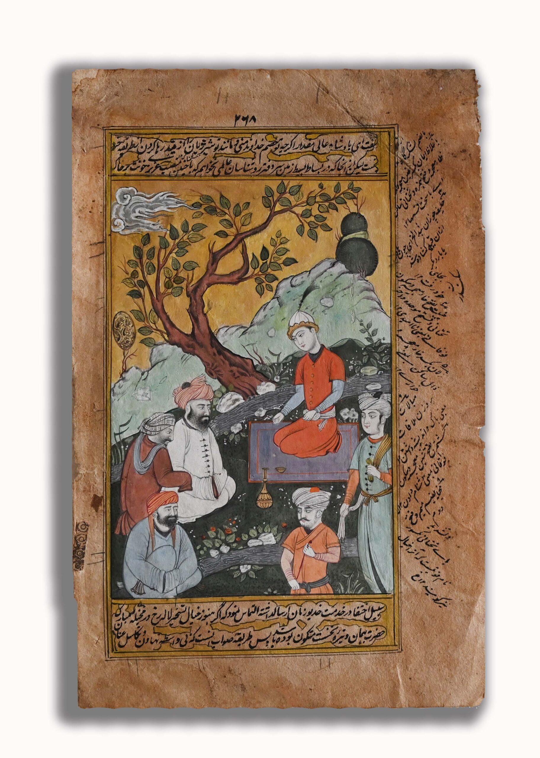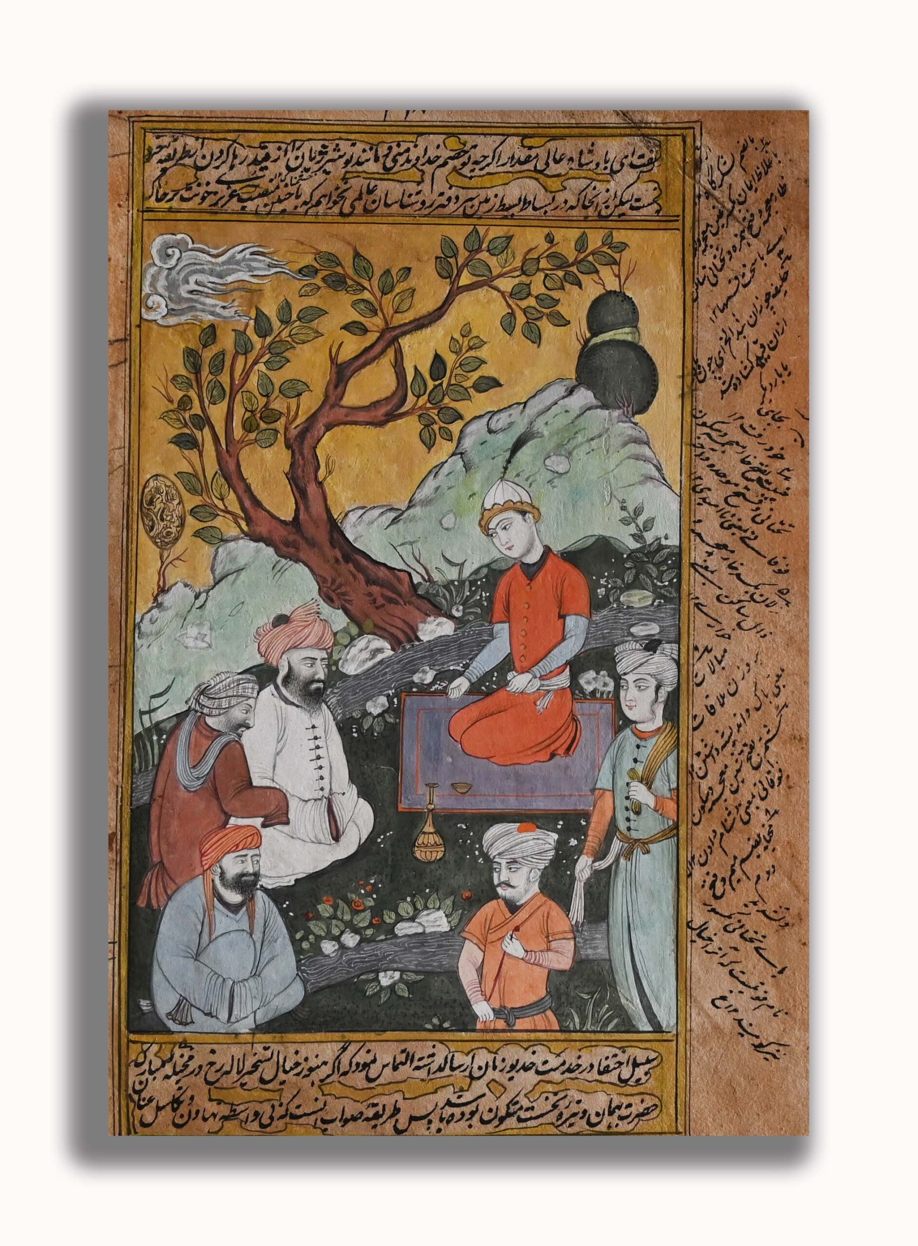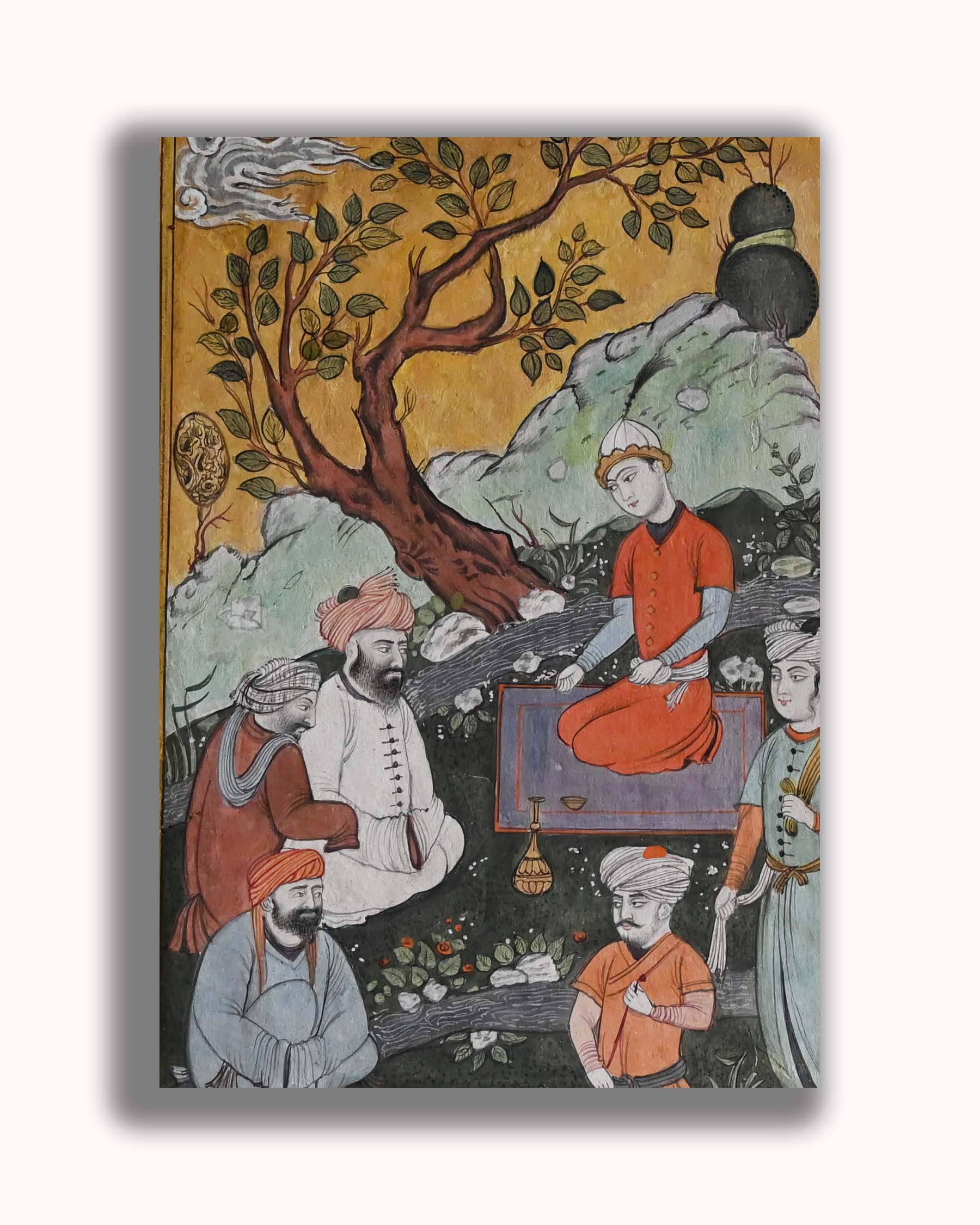 Persian Dastarkhan with Prince & his Uncle & Friend Handmade Miniature PaintingSubject: Persian Miniature Painting Paint Material: Water color Presenting you the rare dastarkhan picnic scene with uncle & friends. |