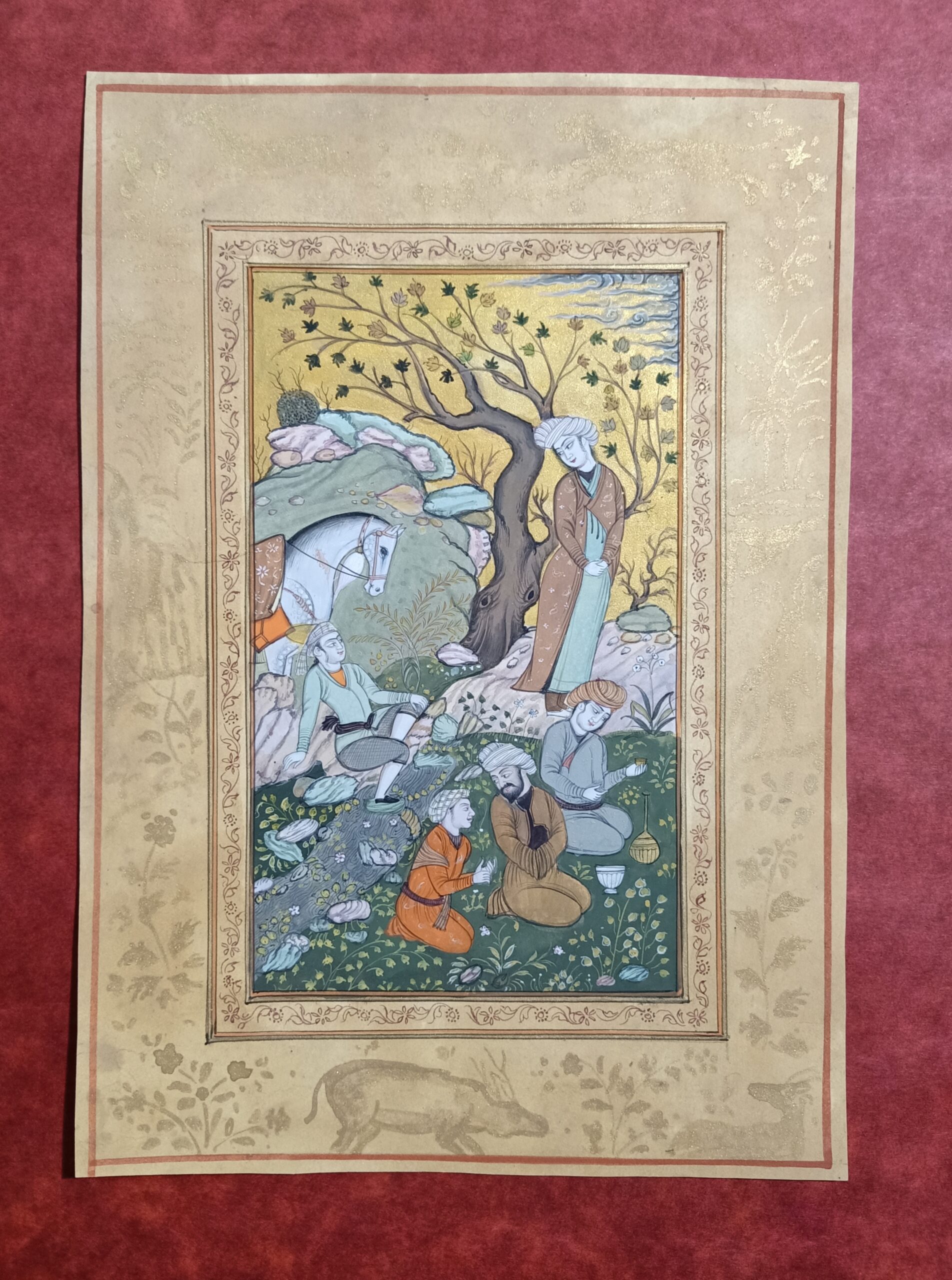 | Presenting you the Persian Youth Enjoying Picnic Rare Persian Handmade Miniature Painting |