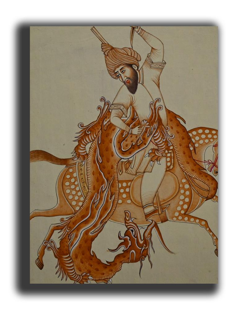 Presenting you the warrior painting of persian king hunting a dragon while riding horse.