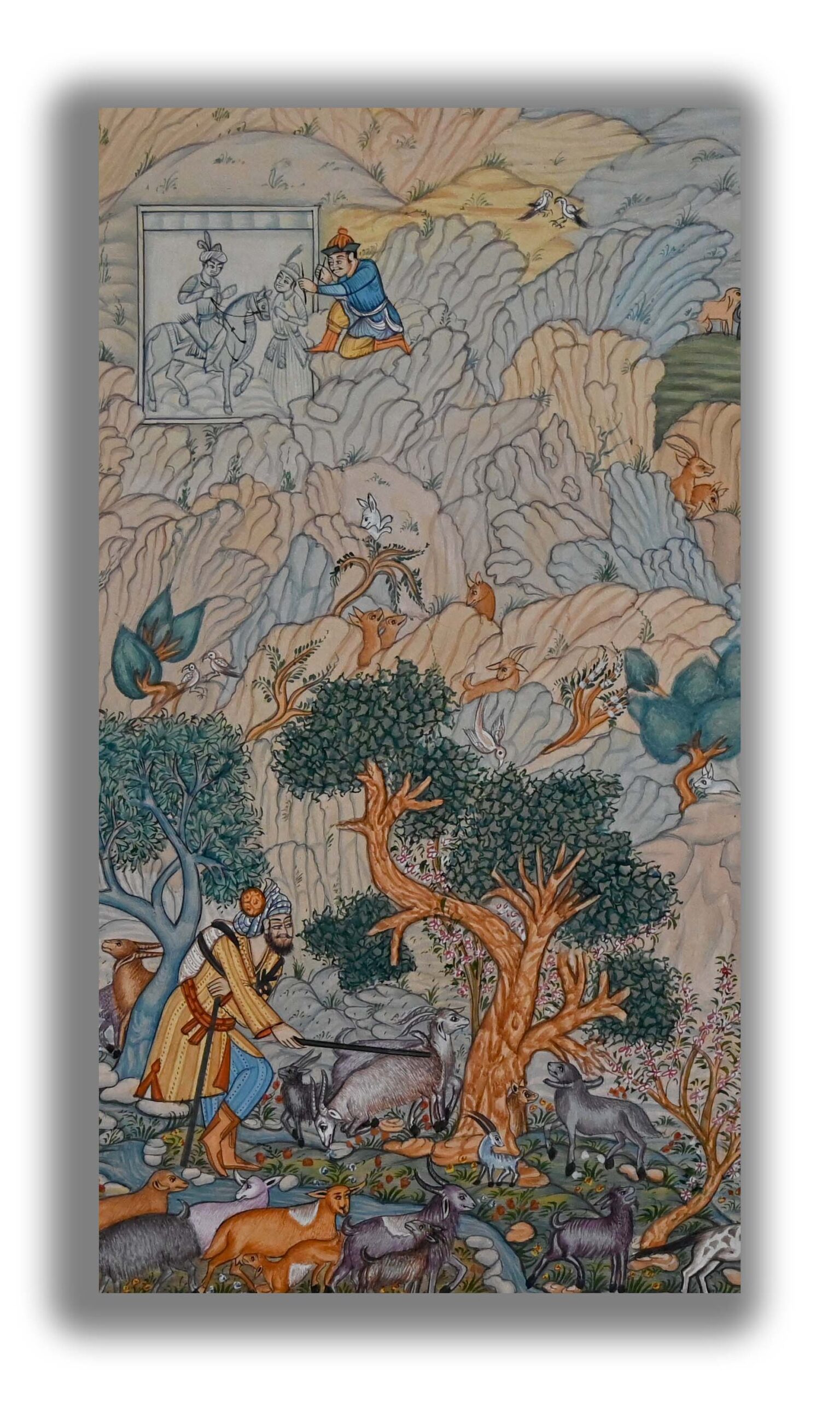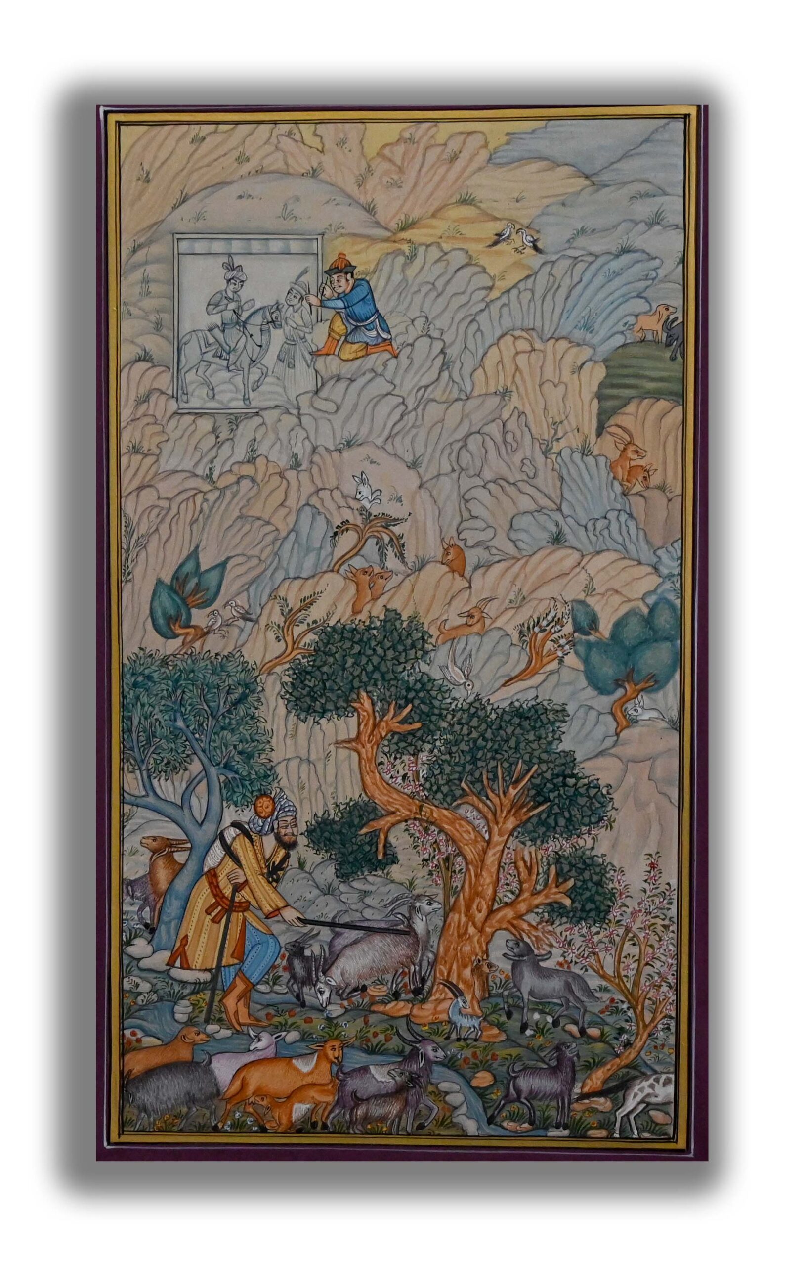 Presenting a rare and dazzling Persian miniature painting of goat herder at mountain with his goats