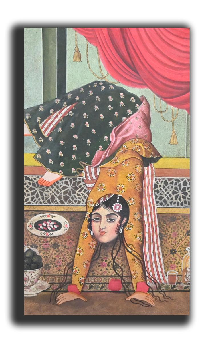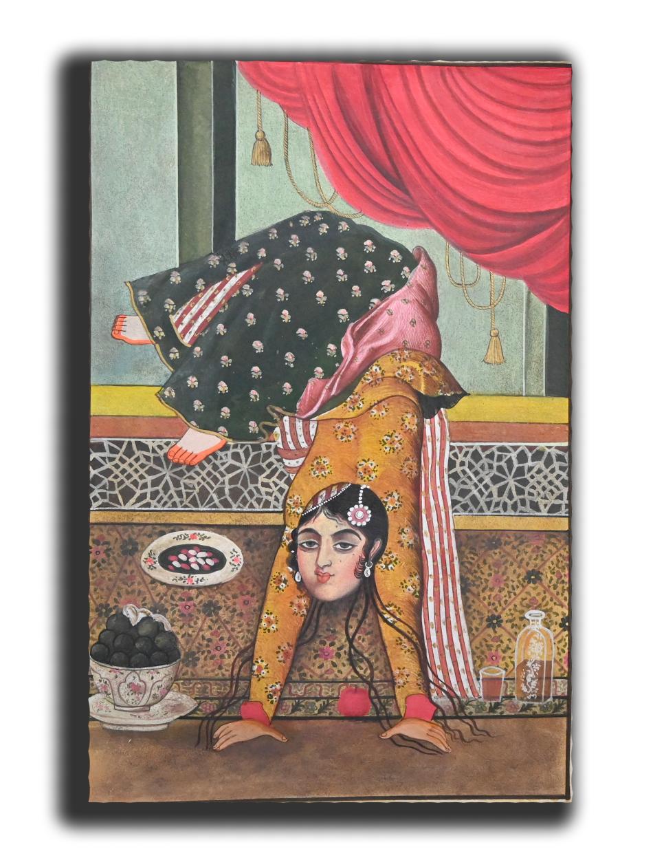 Presenting a rare and unique Persian Portrait Miniature Painting A Lady doing Acrobat doing handstand A Tribute To Persian Artist Mohmad Hassan.