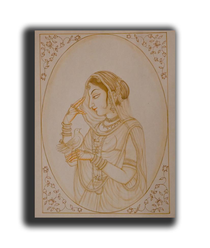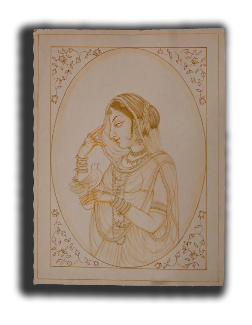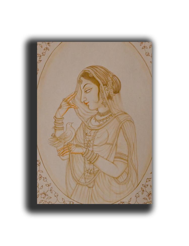 Rajputana Maharani Holding Pigeon Portrait Painting Shahkalam Handmade Art