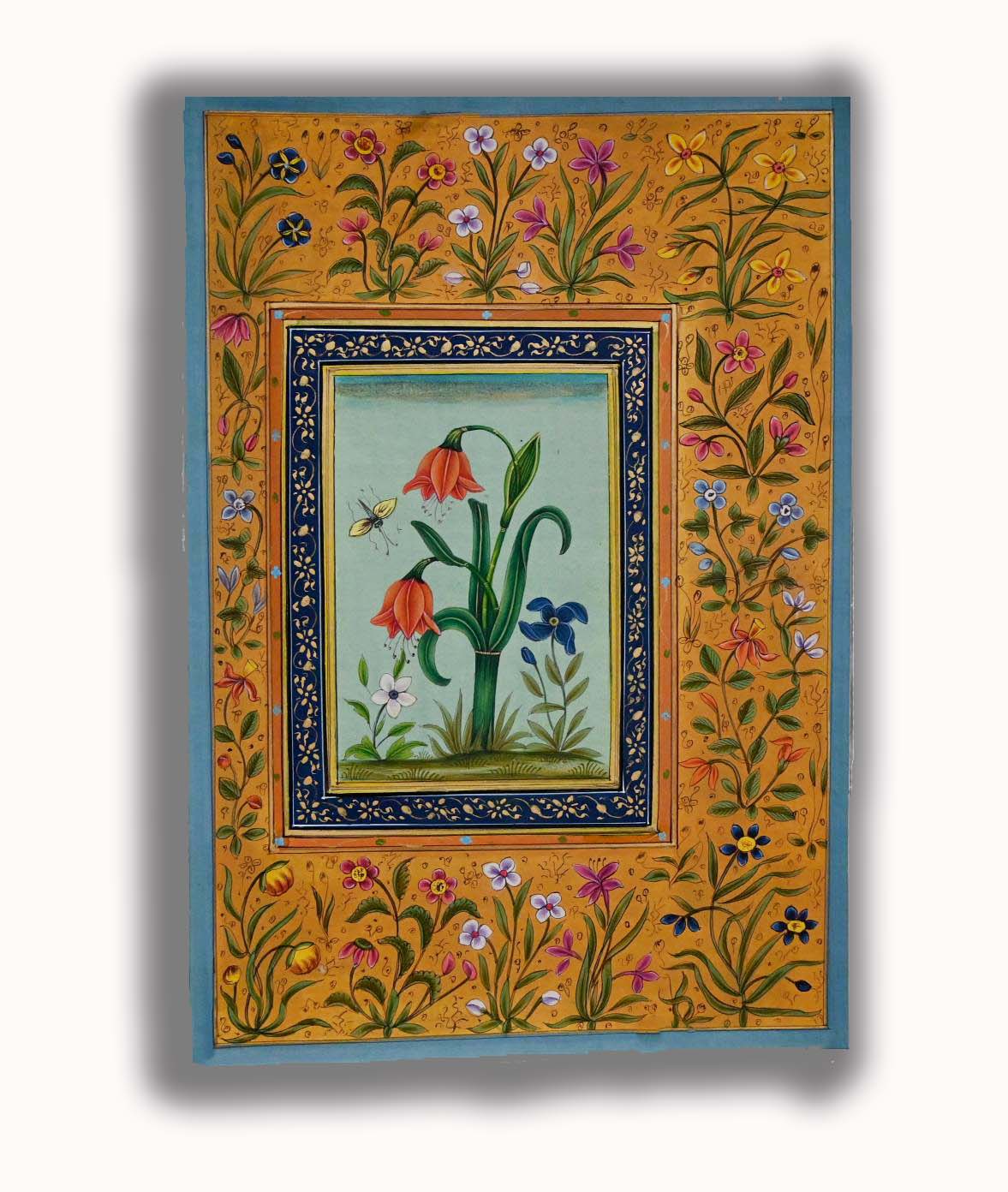 This is a handmade miniature painting featuring a beautifully Red Amaryllis Flower. surrounded by beautiful designed of small flower colorful border outside border Flowers are rendered with fine detailing, reflecting the elegance and precision characteristic of traditional miniature art.