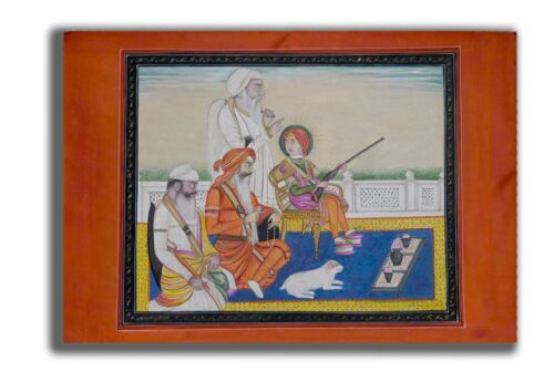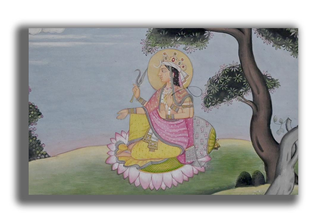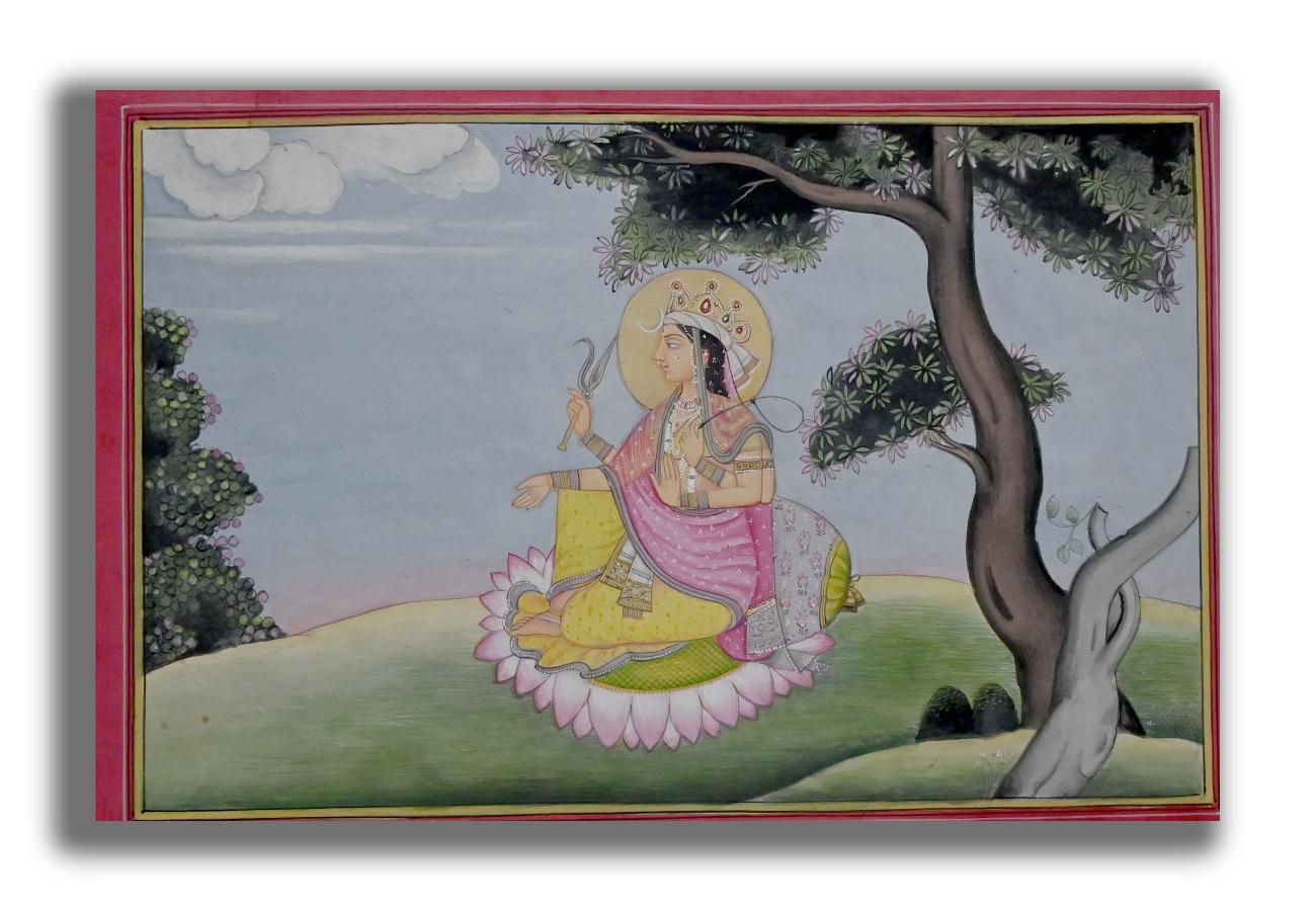 Devi’s face is as luminous as the rising sun; her whole body appears to be glittering with divine light; her ornaments and garments present an enchanting spectacle. In a happy mood, she looks like a young woman. The trees in the background are painted with careful attention. The sky and the earth are clearly demarcated. Indeed each visible object has been painstakingly rendered.