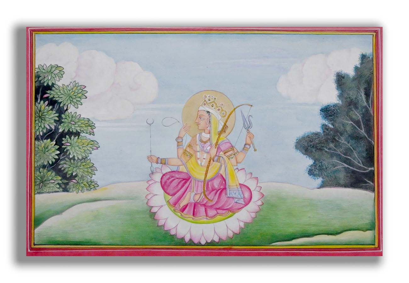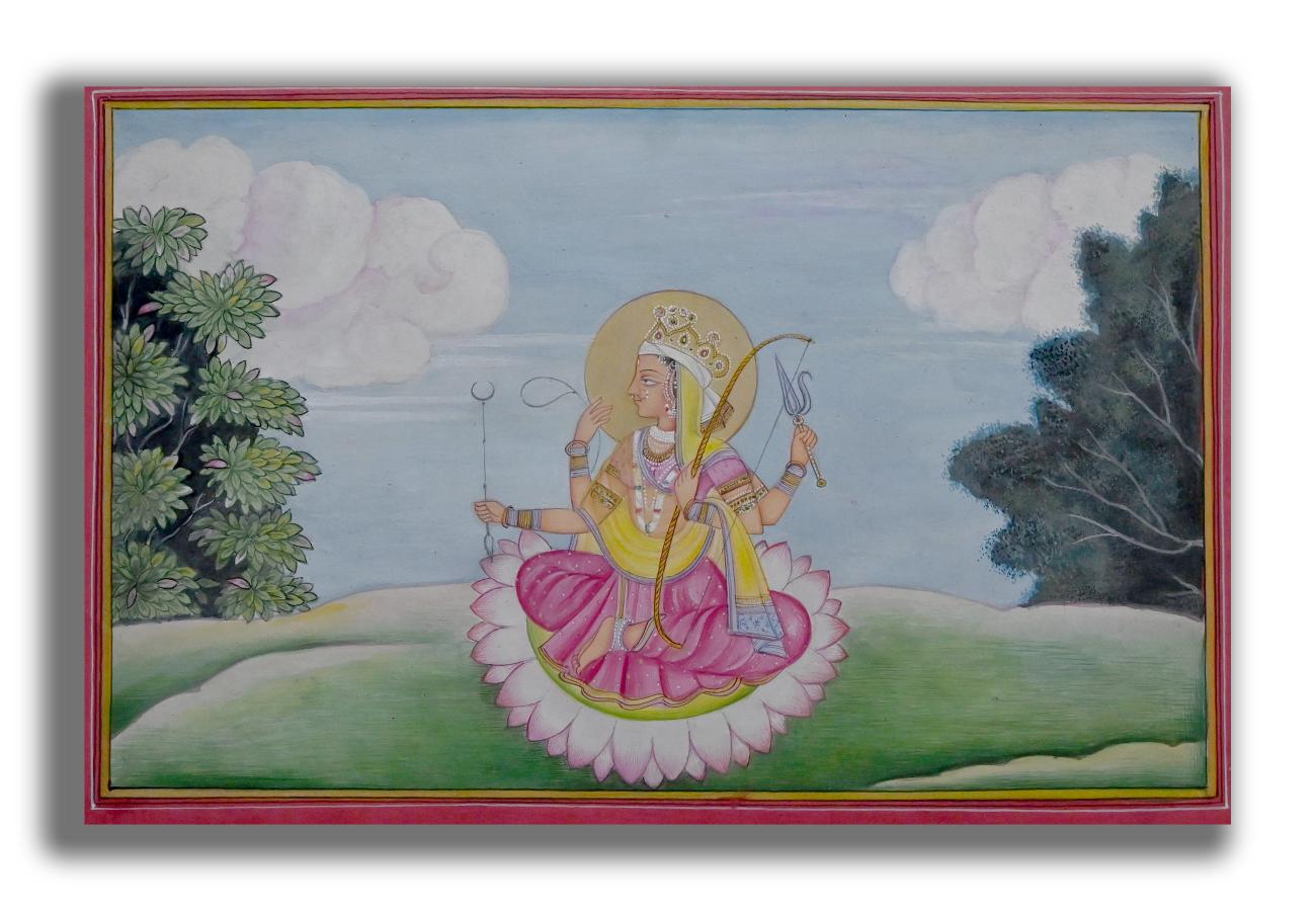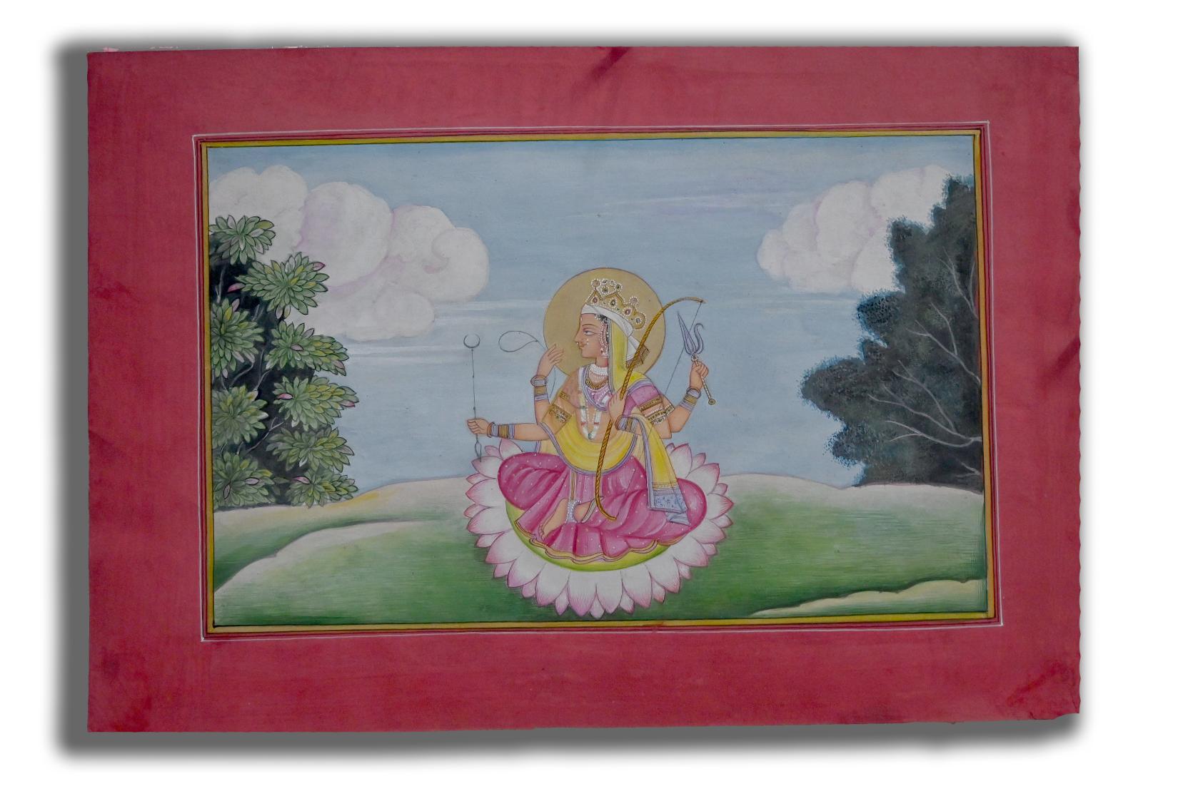 Verily, on a mundane level, if a man, in utter despair and despondency, approaches the goddess in supplication and self-surrender, he achieves what he needs and is protected from evil. - Devi’s face is as luminous as the rising sun; her whole body appears to be glittering with divine light; her ornaments and garments present an enchanting spectacle. In a happy mood, she looks like a young woman. The trees in the background are painted with careful attention. The sky and the earth are clearly demarcated. Indeed each visible object has been painstakingly rendered. Buy it today.