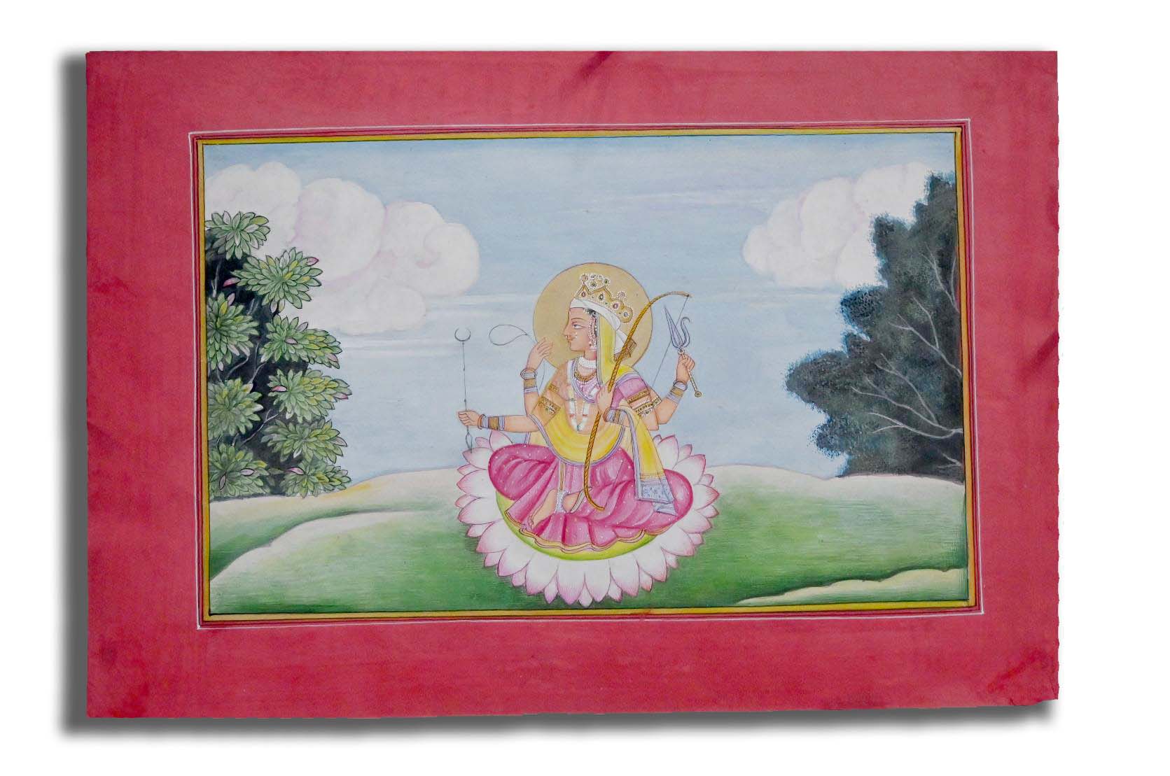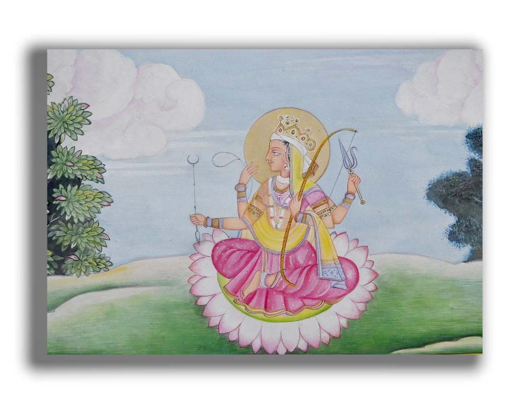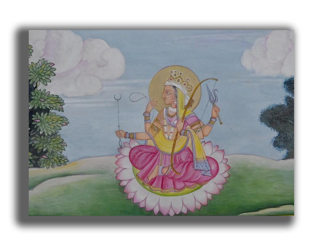 Verily, on a mundane level, if a man, in utter despair and despondency, approaches the goddess in supplication and self-surrender, he achieves what he needs and is protected from evil. - Devi’s face is as luminous as the rising sun; her whole body appears to be glittering with divine light; her ornaments and garments present an enchanting spectacle. In a happy mood, she looks like a young woman. The trees in the background are painted with careful attention. The sky and the earth are clearly demarcated. Indeed each visible object has been painstakingly rendered. Buy it today.