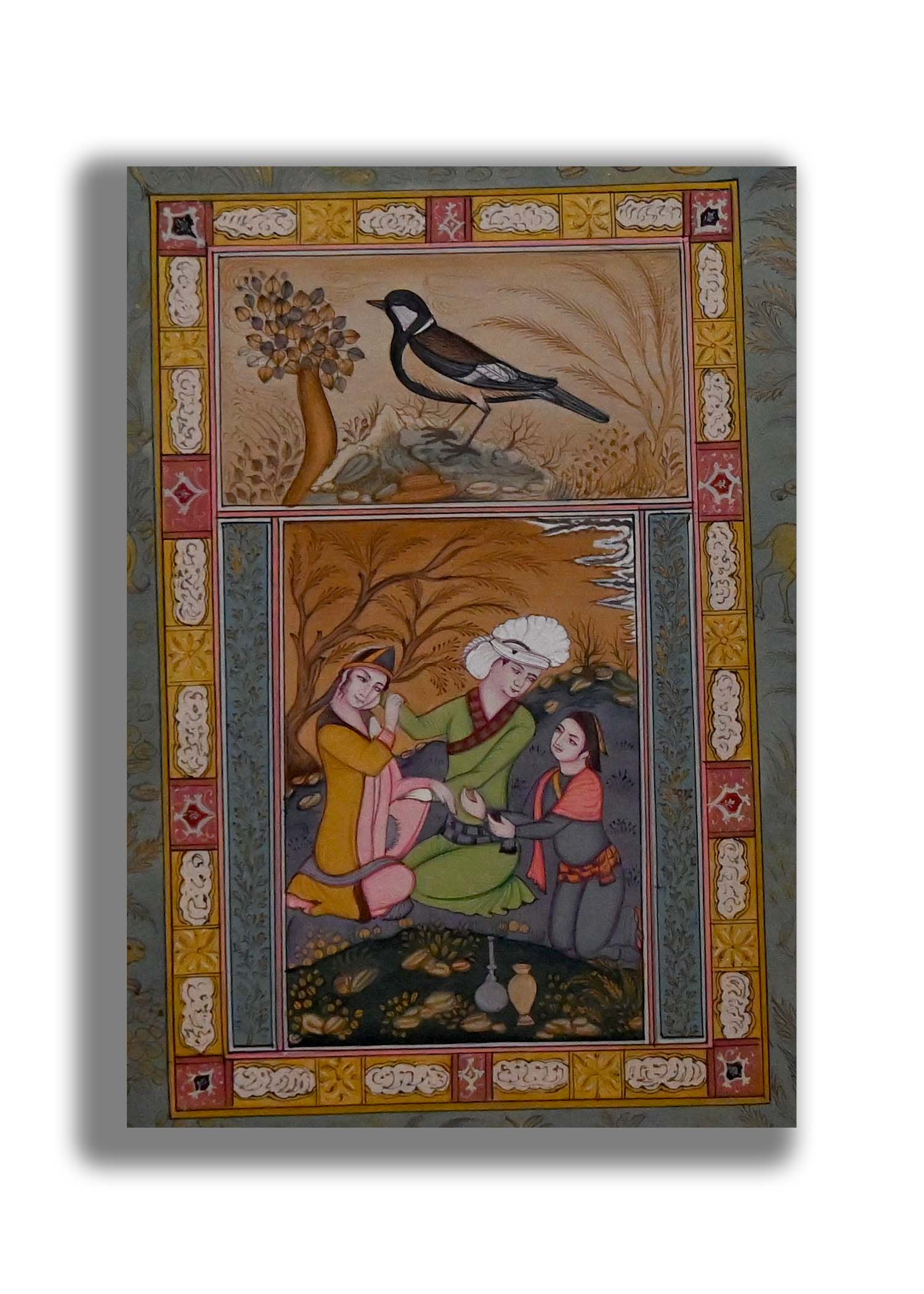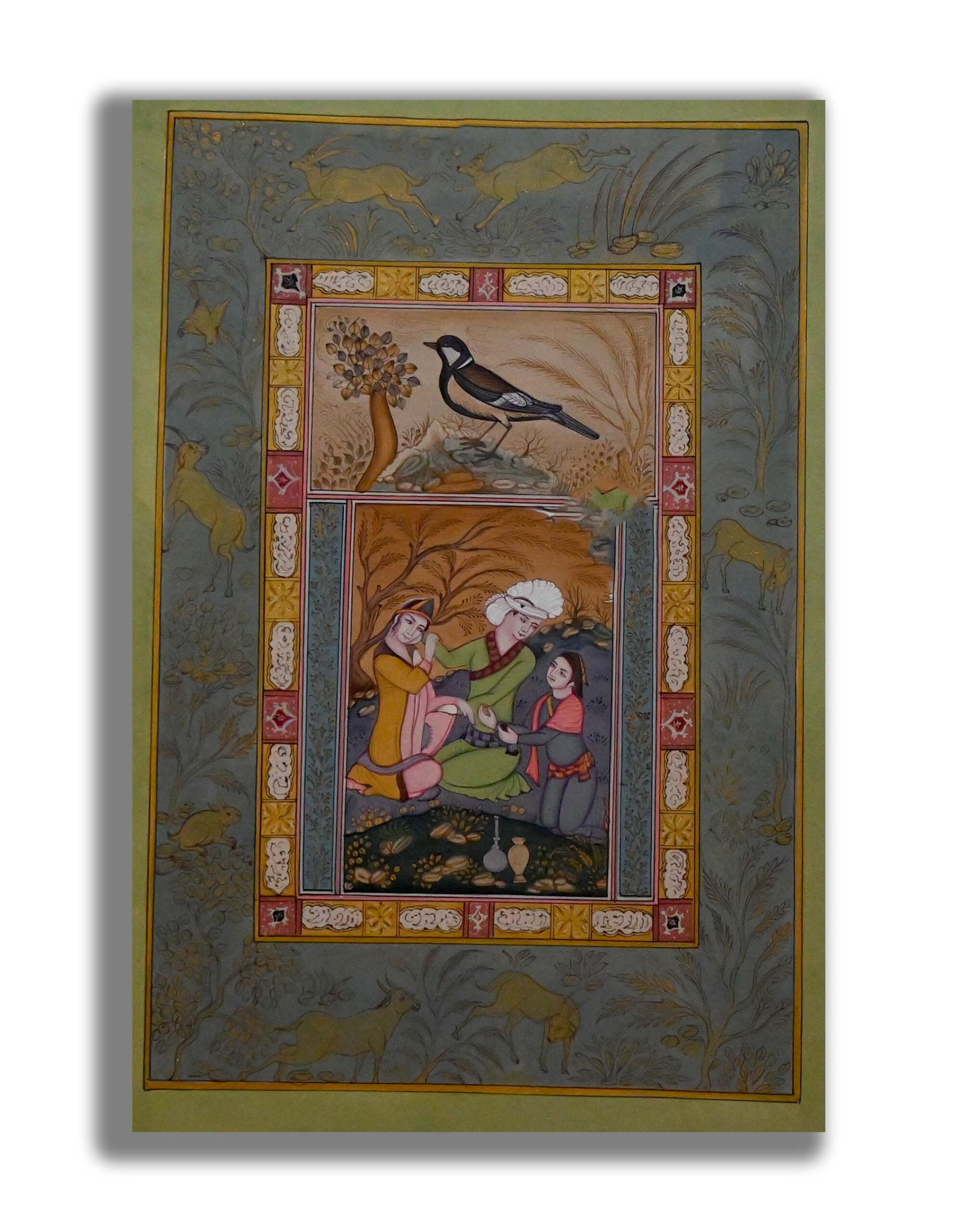 Three Figure Persian Love Miniature Painting on Old Paper with Gold Border